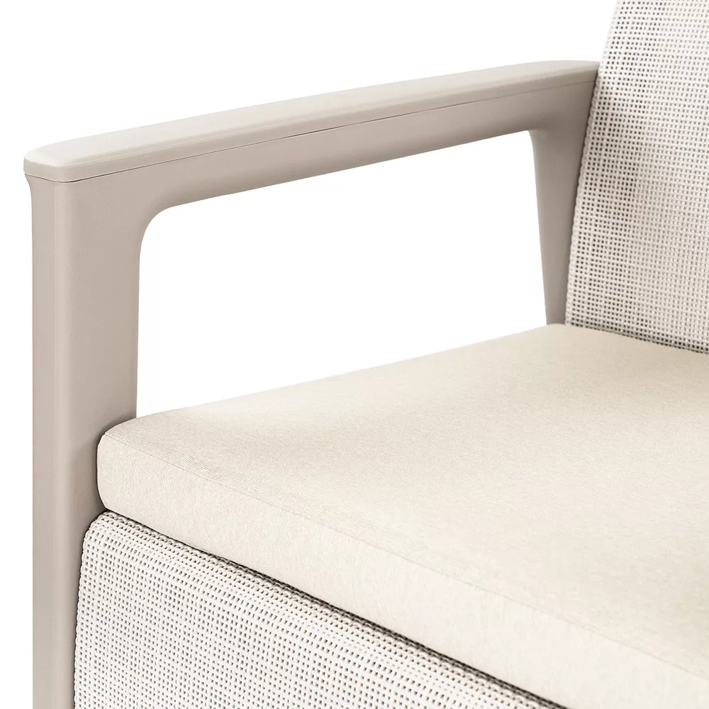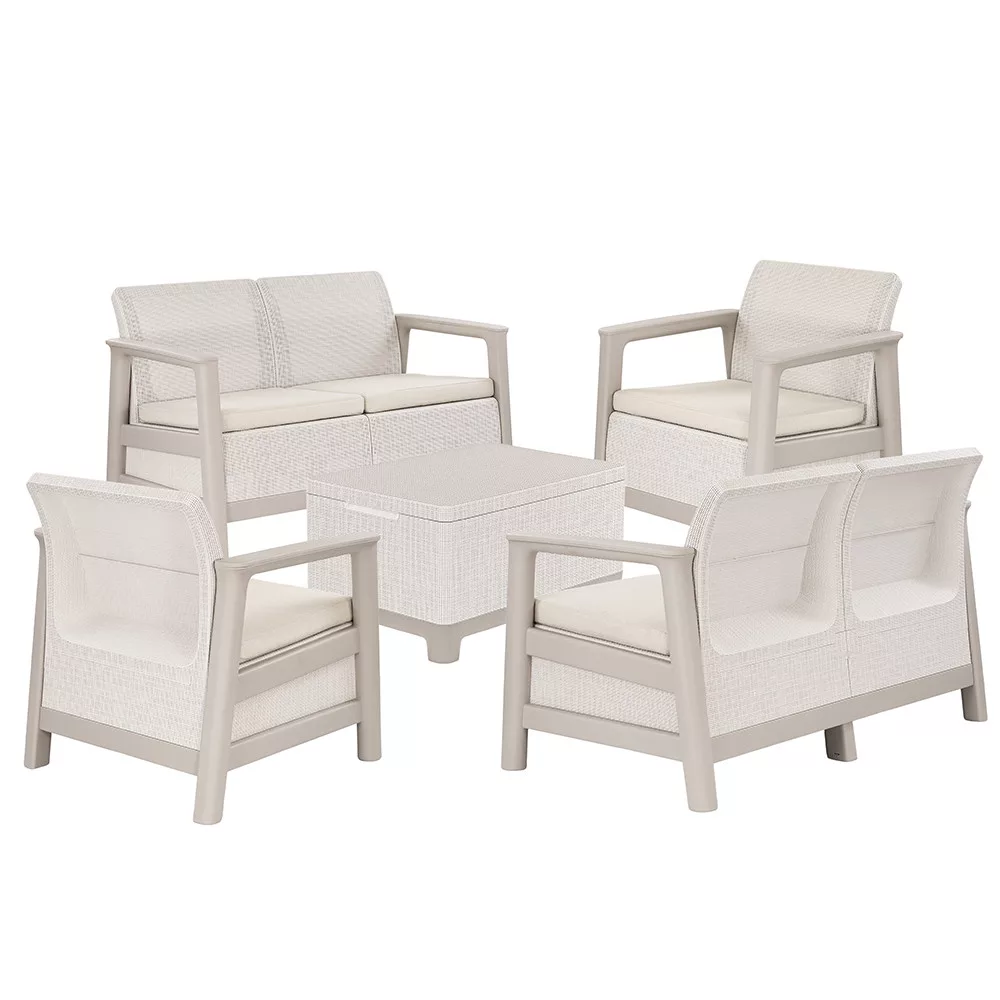 Idealny dla tych, którzy szukają zestawu mebli ogrodowych w kolorze szaro-beżowym, odpornych na warunki atmosferyczne mebli ogrodowych z tworzywa sztucznego, kompaktowego rozwiązania na małe patio lub balkon lub stołu ogrodowego z miejscem do przechowywania. Solidny, nowoczesny i wygodny zestaw do siedzenia na zewnątrz na długi czas.