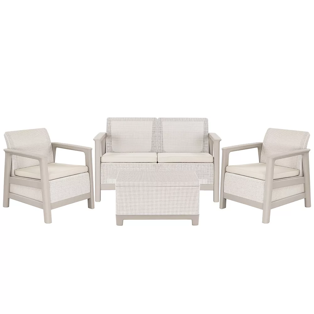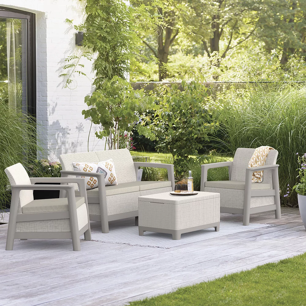 Zestaw tworzy wygodny kącik do rozmów w ogrodzie lub na patio. Tworzy jednolitą, nowoczesną przestrzeń mieszkalną na świeżym powietrzu, a stolik do przechowywania zapewnia poręczne miejsce na akcesoria. Odporne na warunki atmosferyczne, bezobsługowe rozwiązanie, które tworzy schludną i przemyślaną przestrzeń zewnętrzną.