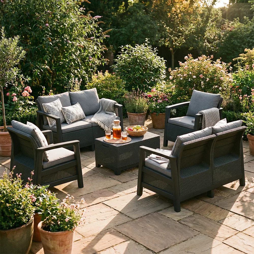 Jest to idealne rozwiązanie dla osób poszukujących zestawu mebli ogrodowych w kolorze grafitowej chłodnej szarości, odpornych na warunki atmosferyczne mebli ogrodowych z tworzywa sztucznego, kompaktowego rozwiązania na małe patio lub balkon lub stołu ogrodowego z miejscem do przechowywania. Solidny, nowoczesny i wygodny zestaw do siedzenia na zewnątrz na długi czas.