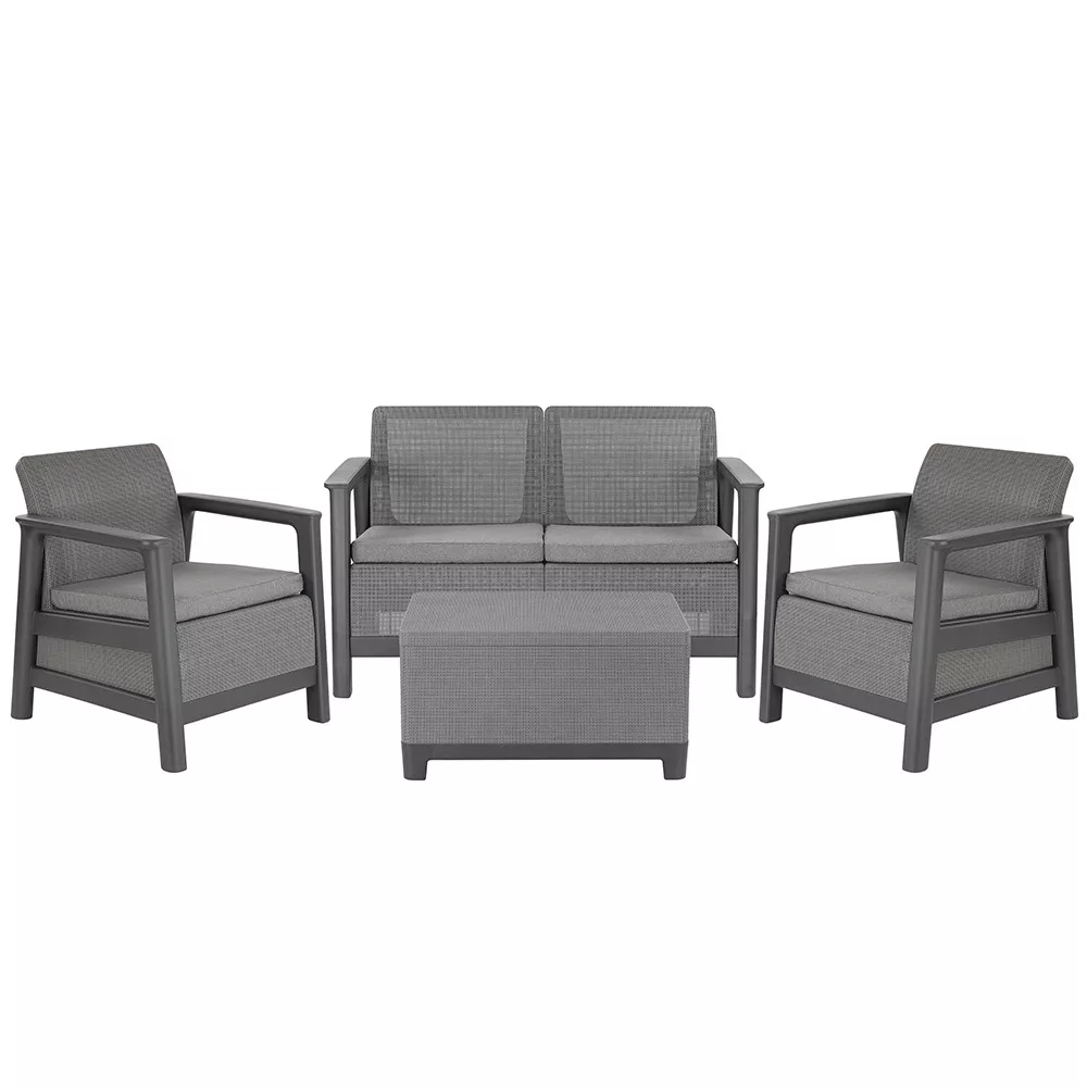 Jest to idealne rozwiązanie dla osób poszukujących zestawu mebli ogrodowych w kolorze grafitowej chłodnej szarości, odpornych na warunki atmosferyczne mebli ogrodowych z tworzywa sztucznego, kompaktowego rozwiązania na małe patio lub balkon lub stołu ogrodowego z miejscem do przechowywania. Solidny, nowoczesny i wygodny zestaw do siedzenia na zewnątrz na długi czas.