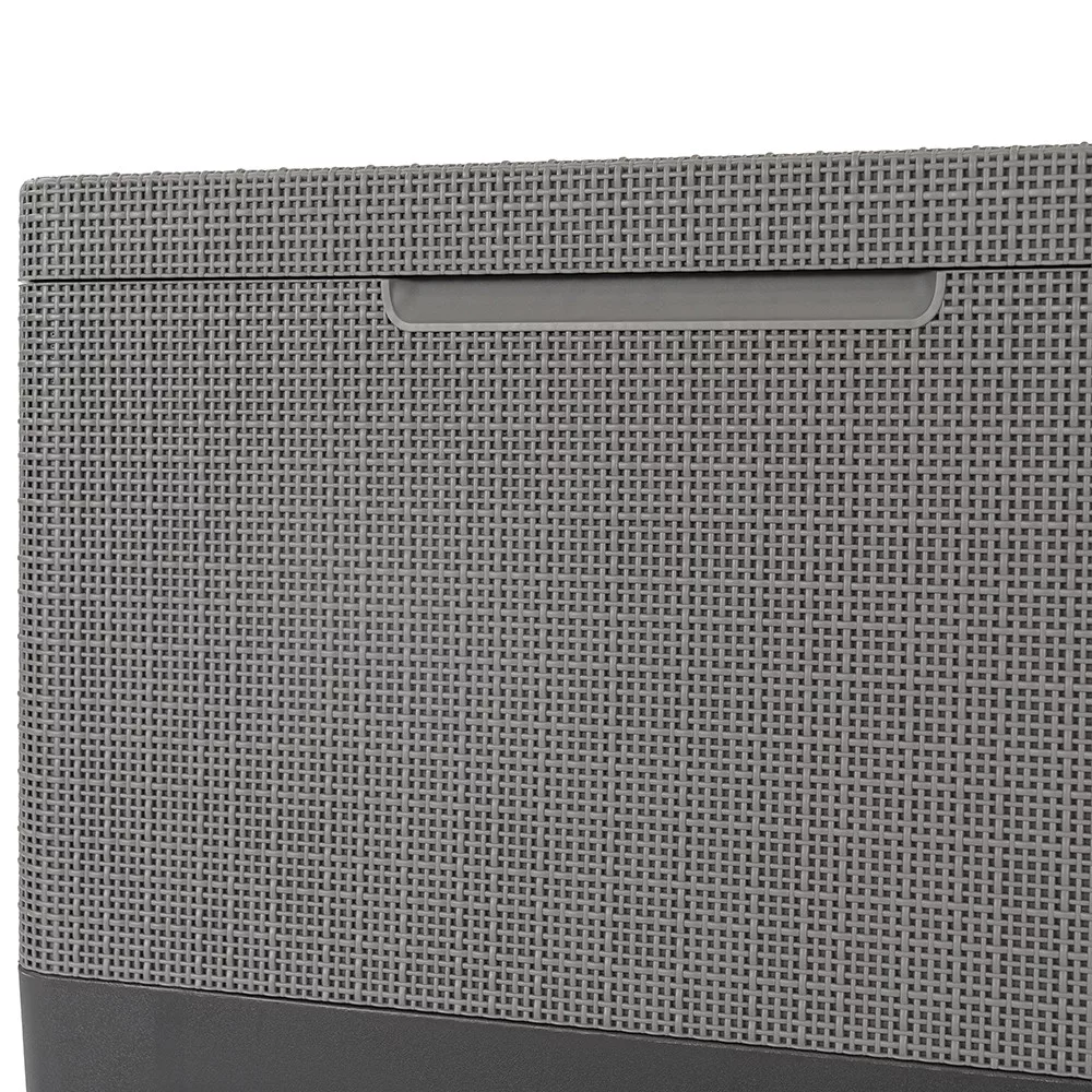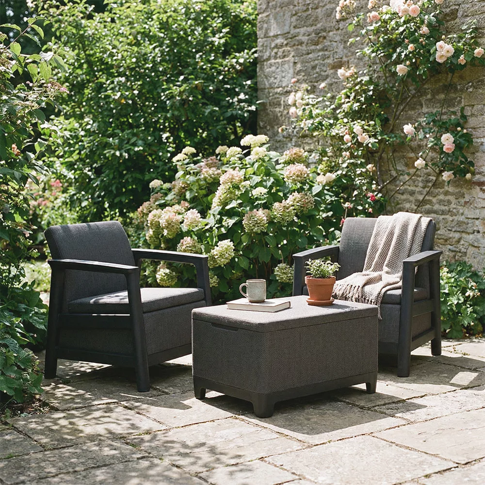 Jest to idealne rozwiązanie dla osób poszukujących zestawu mebli ogrodowych w kolorze grafitowej chłodnej szarości, odpornych na warunki atmosferyczne mebli ogrodowych z tworzywa sztucznego, kompaktowego rozwiązania na małe patio lub balkon lub stołu ogrodowego z miejscem do przechowywania. Solidny, nowoczesny i wygodny zestaw do siedzenia na zewnątrz na długi czas.