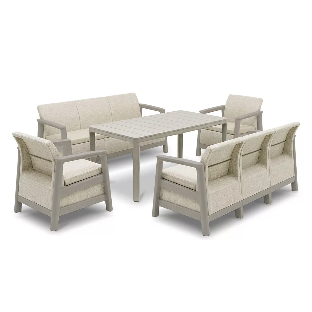 Zestaw jest wykonany z tworzywa sztucznego odpornego na deszcz, wilgoć i promieniowanie UV, co czyni go optymalnym rozwiązaniem do użytku na zewnątrz. Nie wymaga specjalnej obróbki powierzchni, jest odporny na warunki atmosferyczne, dłużej zachowuje kolor i stabilność oraz jest łatwy w czyszczeniu. Solidna konstrukcja nóg i podłokietników zapewnia wygodne podparcie. Fotel i sofa oferują proporcjonalną i dobrze wykorzystaną powierzchnię do siedzenia. Wytrzymałe meble ogrodowe do codziennego użytku.