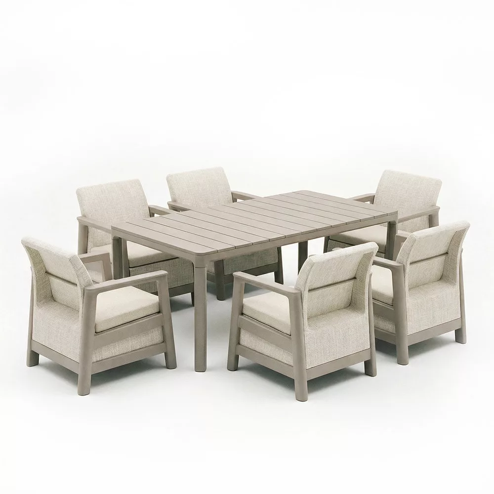 Zestaw mebli ogrodowych Scandi Weekend linea duo nadaje ogrodowi lub patio czysty, jednolity wygląd. Kamyczkowy szaro-beżowy kolor daje naturalny efekt, dobrze komponując się z zielonym otoczeniem i nowoczesną nawierzchnią. Razem 6 foteli i stół ogrodowy tworzą wygodny, kompaktowy zestaw wypoczynkowy do relaksu i rozmów na świeżym powietrzu.