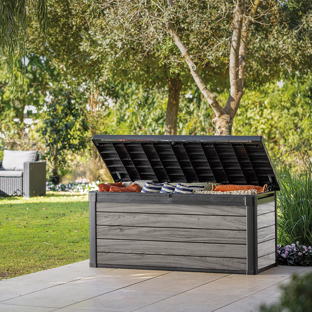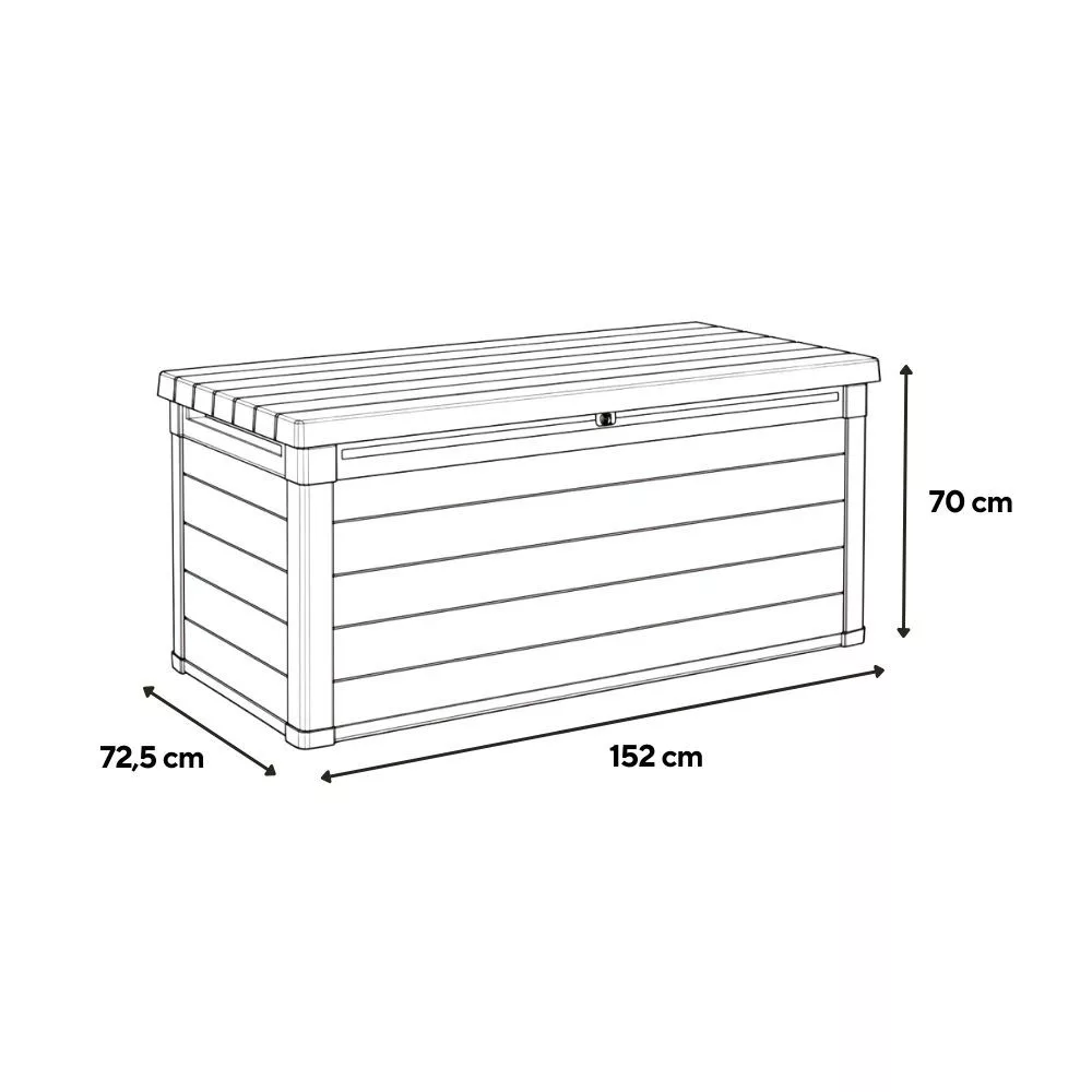 Plastikowa skrzynia ogrodowa Decocoat 570 L burzowa szarość Całkowite dane produktuNazwa produktu: Plastikowa skrzynia ogrodowa Decocoat 570 L burzowa szarośćPojemność: 570 litrówKolor: szary burzowyPowierzchnia: panele drewnopodobne z technologią DecoCoatMateriał: wykończenie z tworzywa sztucznegoKonstrukcja: dach na zawiasach, zamykana pokrywaWymiary zewnętrzne: 152 × 72,5 × 70 cmPlastikowa skrzynia ogrodowa o pojemności 570 litrów do uporządkowanego przechowywania na zewnątrzPlastikowa skrzynia ogrodowa Decocoat 570 L w kolorze burzowej szarości to idealne rozwiązanie do przechowywania dużych ilości poduszek, koców, narzędzi ogrodowych lub akcesoriów basenowych. Pojemność 570 litrów zapewnia dużo miejsca na zorganizowane przechowywanie akcesoriów na patio lub w ogrodzie. Pokrywa na zawiasach zapewnia szybki i wygodny dostęp do przechowywanych przedmiotów.Nowoczesny szary schowek ogrodowy z wykończeniem z naturalnego drewnaDrewniane wykończenie DecoCoat™ nadaje skrzyni estetyczny wygląd. Burzowy odcień szarości nadaje jej czysty, nowoczesny charakter, który dobrze komponuje się ze współczesnymi meblami ogrodowymi i minimalistycznym wystrojem tarasu.Praktyczne miejsce do przechowywania na patio i w ogrodzieSolidna konstrukcja i proporcjonalny design pozwalają na łatwe umieszczenie skrzyni ogrodowej na dużym patio, w ogrodzie, a nawet w zadaszonej przestrzeni zewnętrznej. Zamykana pokrywa pomaga zabezpieczyć przechowywane przedmioty, a duża pojemność pomaga stworzyć uporządkowane, przejrzyste środowisko zewnętrzne.Dla kogo przeznaczona jest plastikowa skrzynia ogrodowa Decocoat 570 L storm grey?Zalecany dla każdego, kto szuka plastikowego pojemnika ogrodowego o pojemności 570 litrów do przechowywania poduszek, akcesoriów sezonowych i większych narzędzi ogrodowych. Idealny do średnich i większych tarasów, rodzinnych ogrodów przydomowych, gdzie ważne jest uporządkowane przechowywanie i estetyczny wygląd.