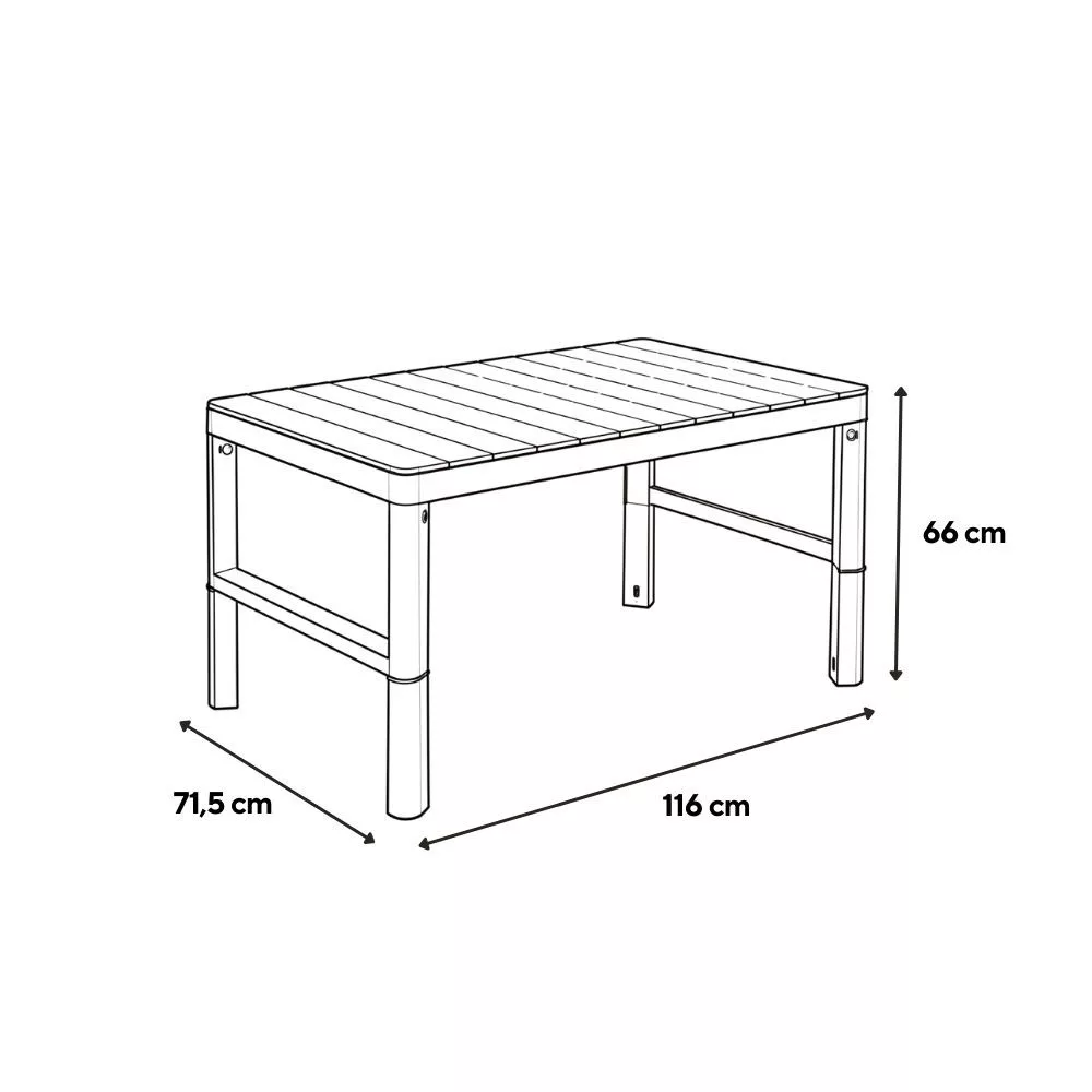 A Deco Lyon kerti asztal különleges kialakításának köszönhetően két különböző magasságban használható. Alacsony állásban kényelmes dohányzóasztalként, magasabb pozícióban pedig praktikus étkezőasztalként szolgál, így könnyen alkalmazkodik a különböző igényekhez.
