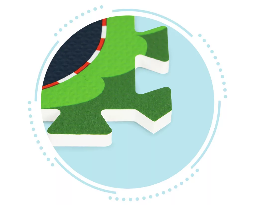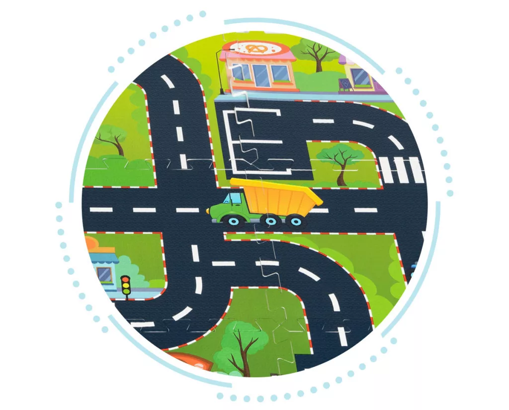 Dywan posiada wzór miast, dróg i ulic. Sprawia to, że jest to kreatywna i świetna forma rozrywki dla małych miłośników samochodów i pojazdów. Każdy szczegół jest jaskrawo kolorowy i starannie zaprojektowany, aby zachęcić dzieci do odkrywania i interakcji . Może być również używany dochodzenia, raczkowania, nauki relaksu lub jako koc piknikowy.