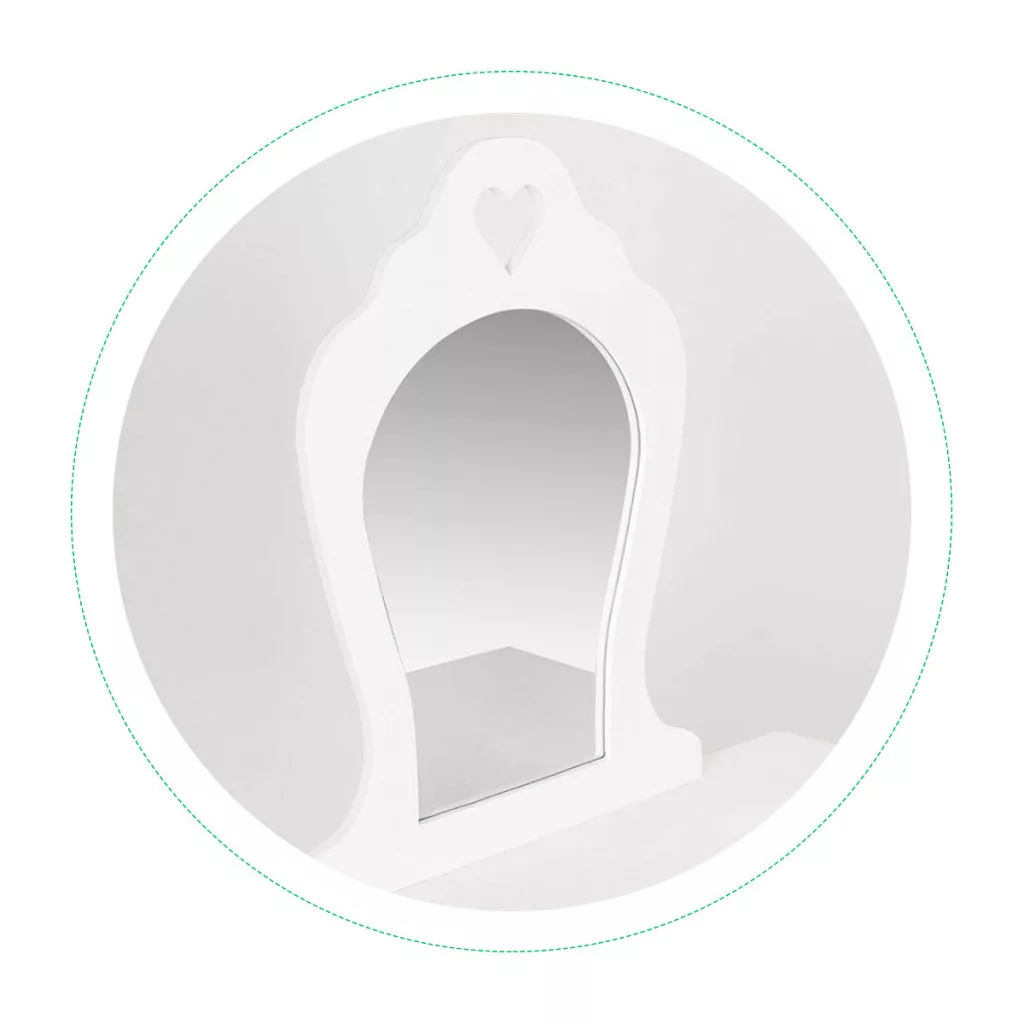 Główną cechą tej toaletki jest duże, dekoracyjne lustro, które dodaje uroku i pozwala dziewczynce obserwować swoje ubranka i bawić się. Pięknie zaprojektowany kształt lustra nadaje toaletce elegancki i dziewczęcy wygląd.