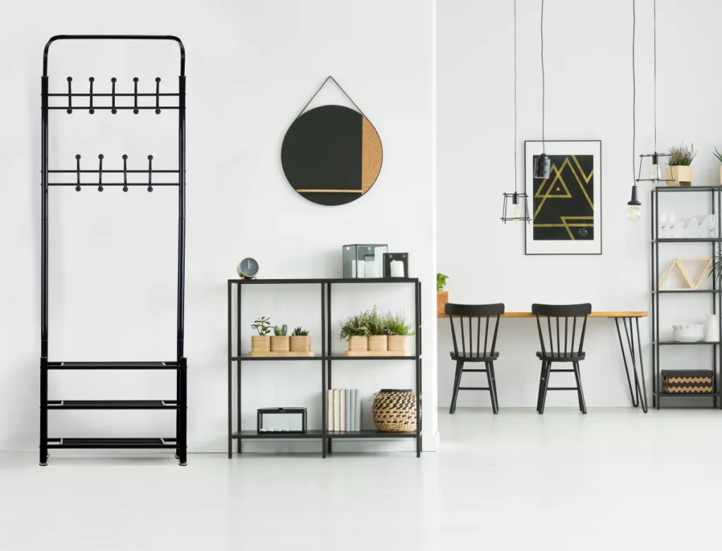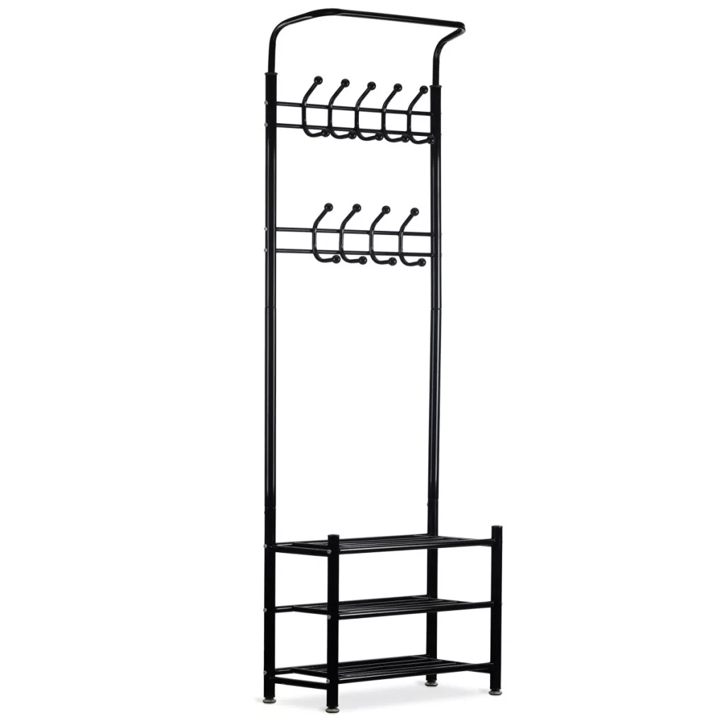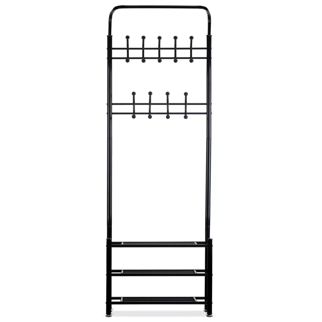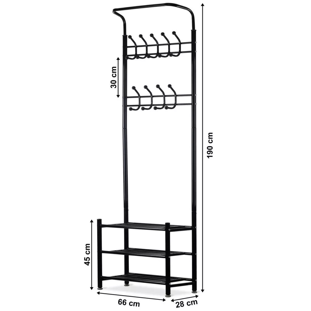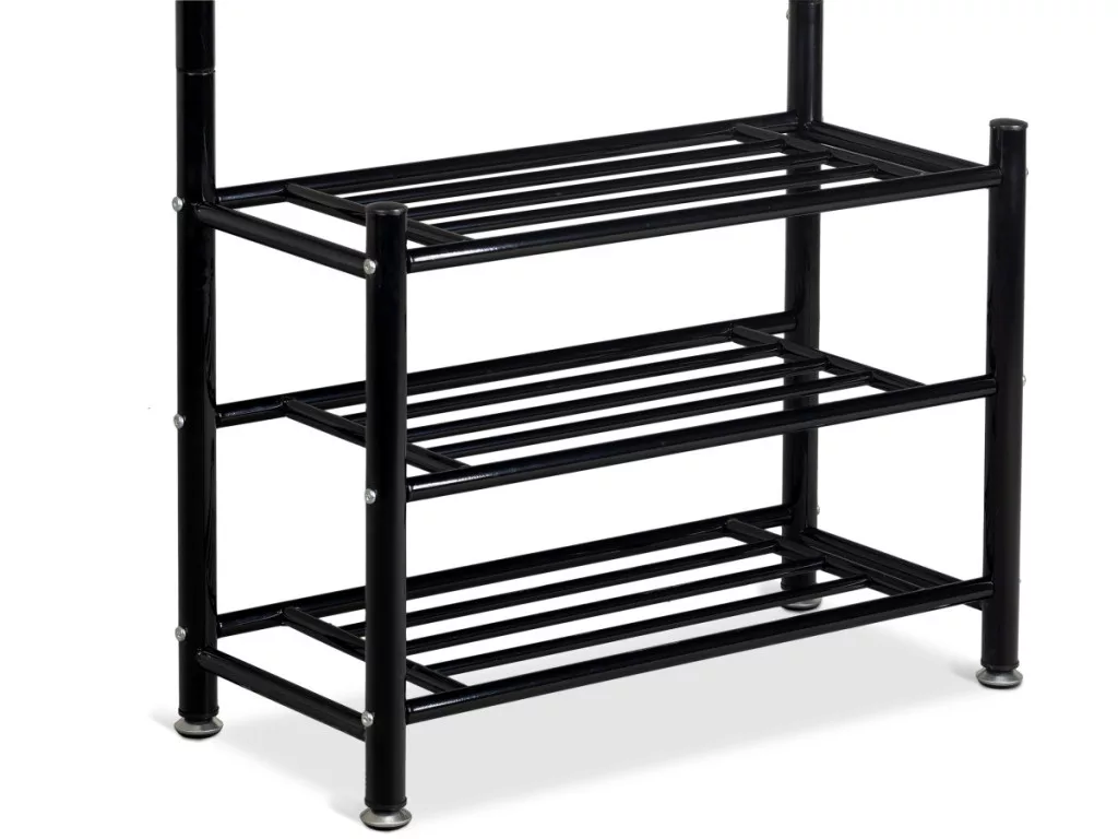 Dolna część wieszaka posiada trzy funkcjonalne półki do przechowywania drobnych elementów garderoby, torebek, a nawet butów.