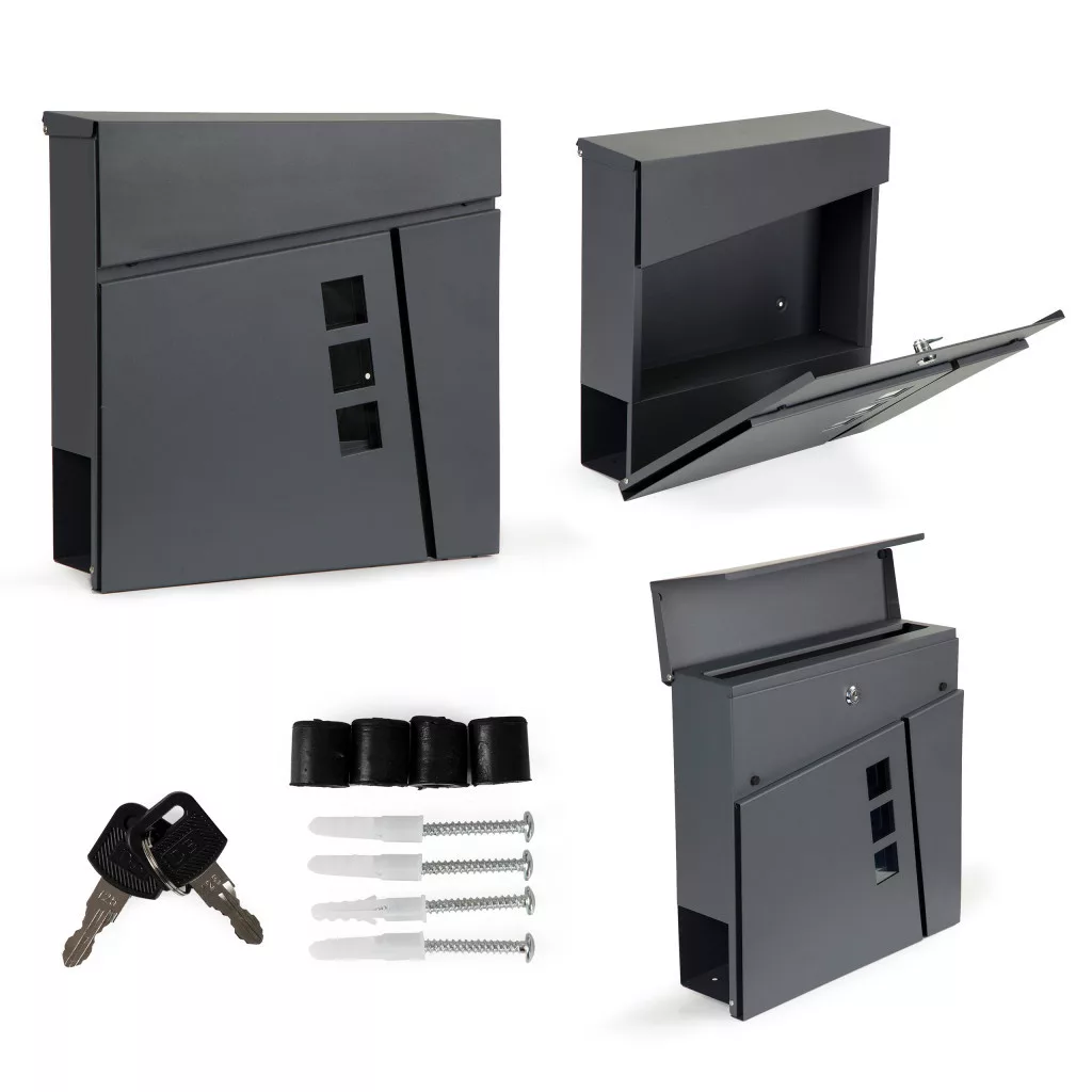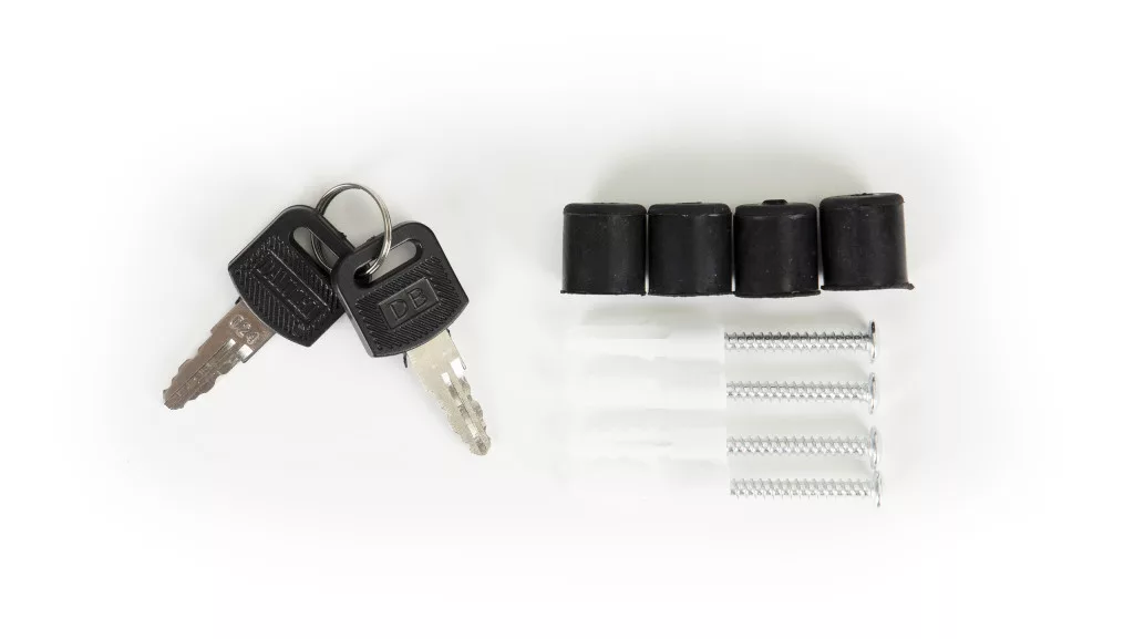 Wraz ze skrzynką otrzymasz zestaw montażowy - 4 kołki i podkładki dystansowe, dzięki czemu od razu po rozpakowaniu możesz przystąpić do montażu skrzynki. W zestawie znajdują się dwa klucze do otwierania skrzynki.