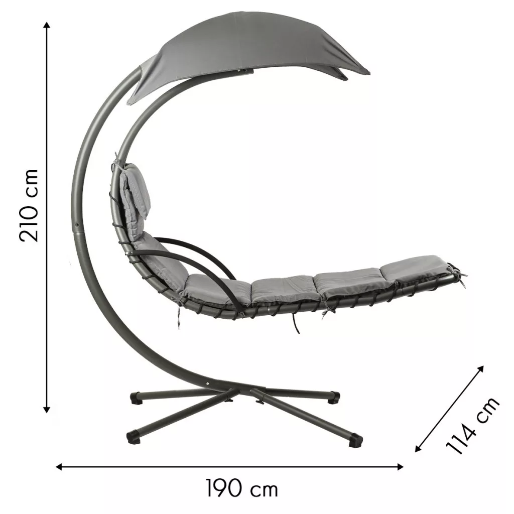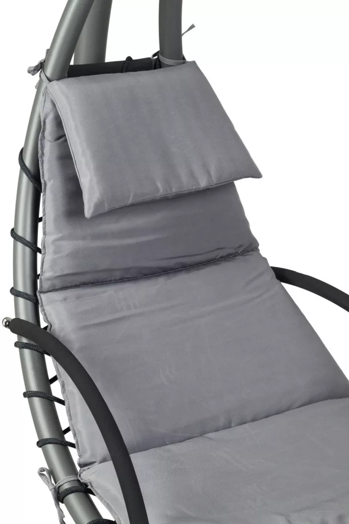 Wiszący leżak zapewnia stabilność i bezpieczeństwo dzięki wzmocnionej ramie, która pozwala na delikatne kołysanie i kołysanie. Duża, regulowana markiza zapewnia cień w upalne dni, a miękki ruch zwiększa doznania relaksacyjne. Wodoodporny, miękki materac z zagłówkiem gwarantuje maksymalny komfort.
