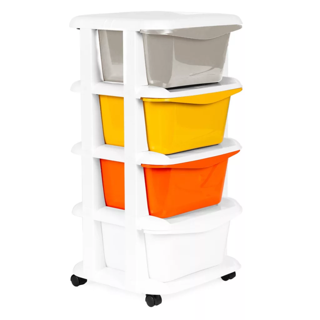Półka składa się z czterech kolorowych szuflad ze specjalnie zaprojektowanymi uchwytami z przodu ułatwiającymi otwieranie i zamykanie.