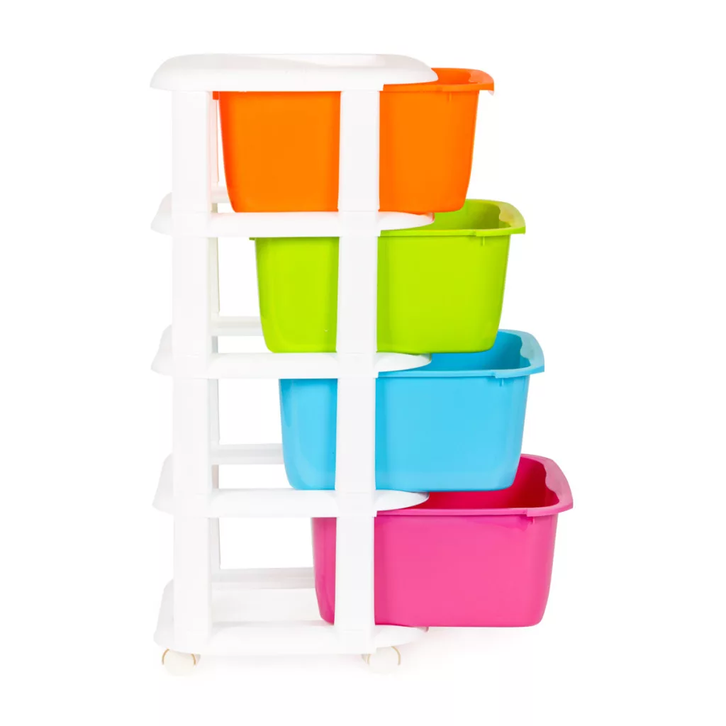 Regał składa się z czterech kolorowych szuflad, ze specjalnie wyprofilowanym uchwytem z przodu ułatwiającym wsuwanie i wysuwanie.