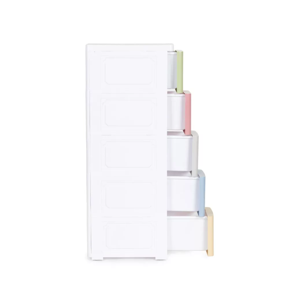Półka składa się z pięciu kolorowych szuflad ze specjalnie wyprofilowanym uchwyt em z przodu ułatwiającym wsuwanie i wysuwanie.