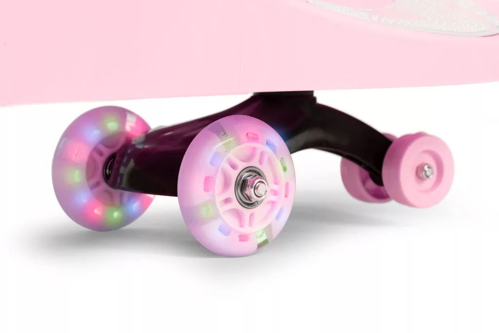 Wózek jest wyposażony w koła LED, które świecą, gdy są w ruchu. Dzięki temu wieczorna zabawa jest bardziej ekscytująca i przyjemna. Podświetlane koła nie tylko przyciągają uwagę, ale także **zwiększają** widoczność dziecka po zmroku, zapewniając większe bezpieczeństwo podczas wieczornych spacerów.