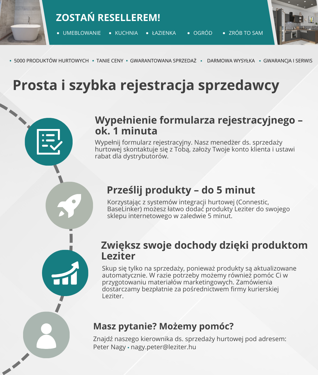 ŁATWE ŁADOWANIE PRODUKTÓW: Produkty Leziter można szybko i łatwo załadować do swojego sklepu internetowego, korzystając z kanału produktowego lub systemów integracji hurtowej (np. Connestic, BaseLinker), dzięki czemu nie trzeba martwić się o ładowanie, ustalanie cen i synchronizację stanów magazynowych, ponieważ wszystko jest zautomatyzowane.