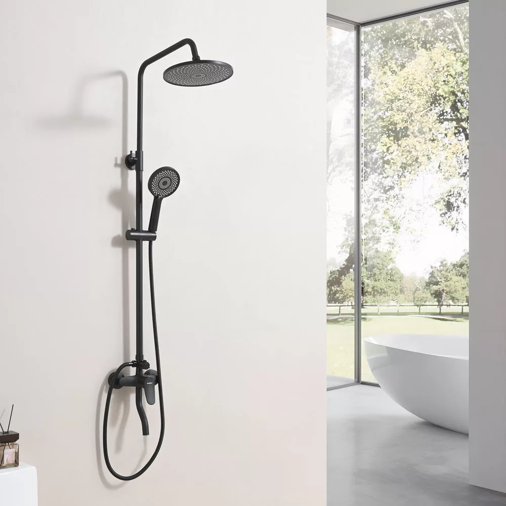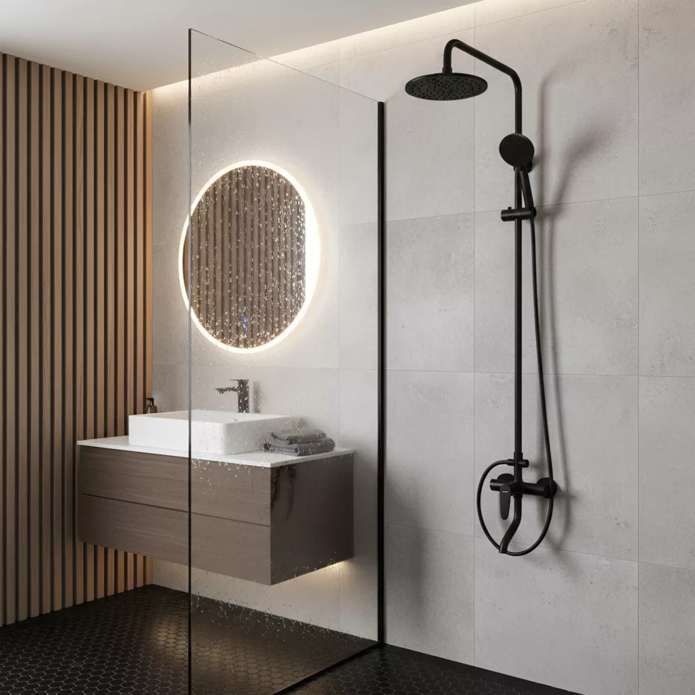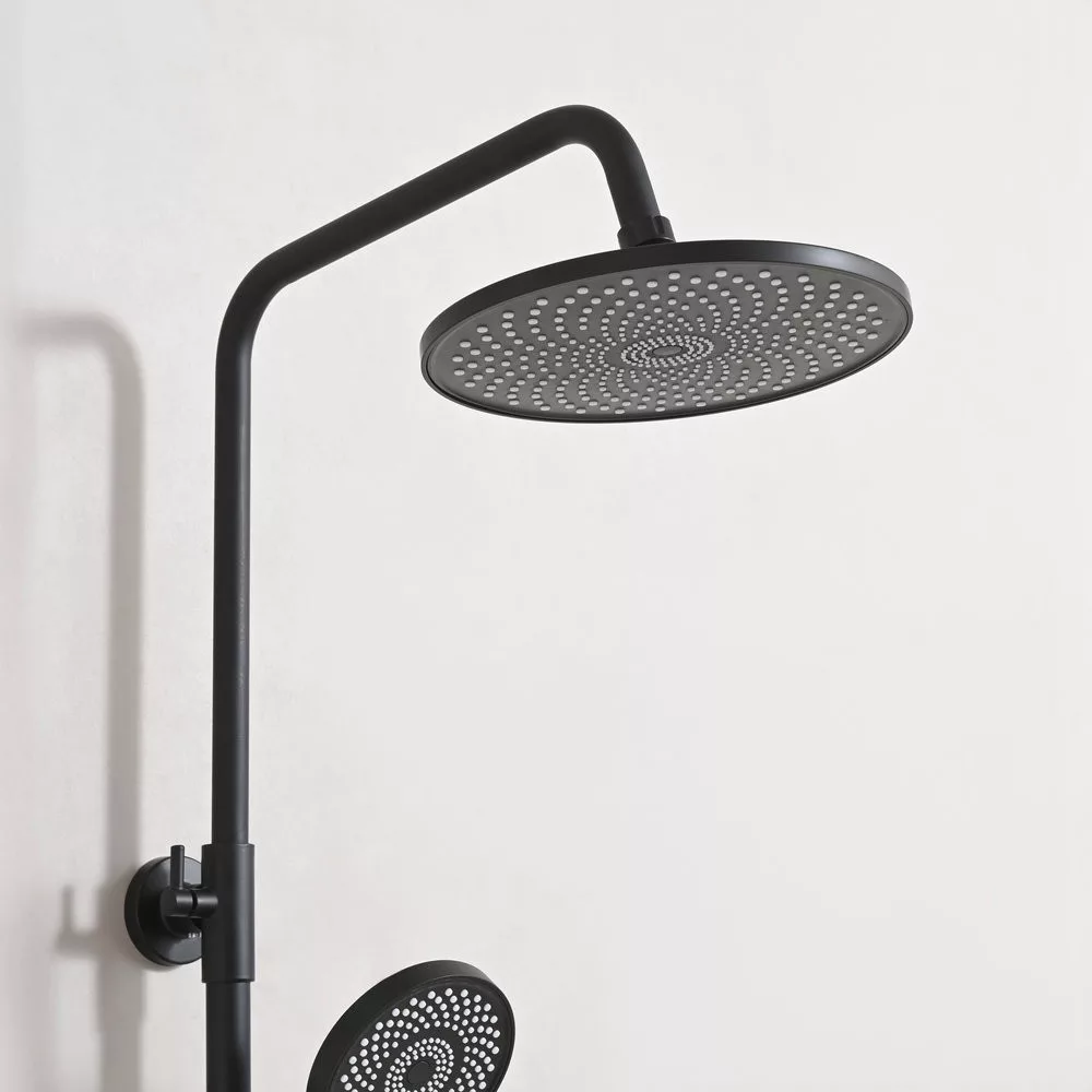 Czarny system prysznicowy wygląda szczególnie dobrze w połączeniu z jasnymi płytkami, w nowoczesnych betonowych lub marmurowych łazienkach. Emanuje siłą, wyrazistością i nowoczesnością, jednocześnie tworząc przestrzeń, która jest wizualnie schludna i ma charakter.