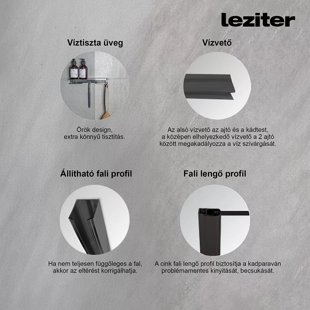 - Fix kádparaván: A másik oldalon nyitott rész marad, így minimális víz kifröccsenhet, amit a zuhanyfej helyes irányításával lehet csökkenteni.