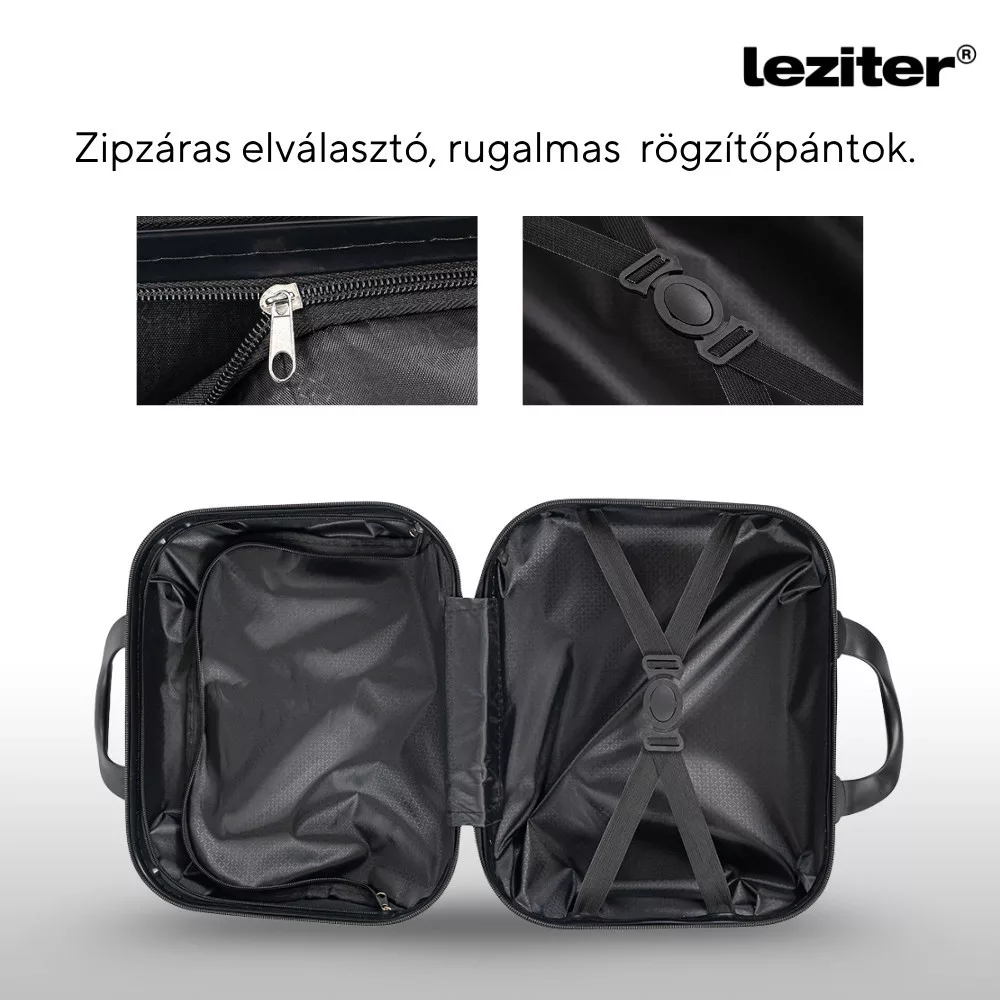 A belső tér cipzáras elválasztóval és rugalmas rögzítőpántokkal van ellátva, így a kisebb tárgyak nem borulnak össze, és mindig minden a helyén marad. A hátoldali pánt segítségével a neszeszer könnyedén rögzíthető egy nagyobb gurulós bőrönd húzószárára – ez különösen előnyös, ha több csomaggal utazol. Szabad kezek, gördülékeny haladás.