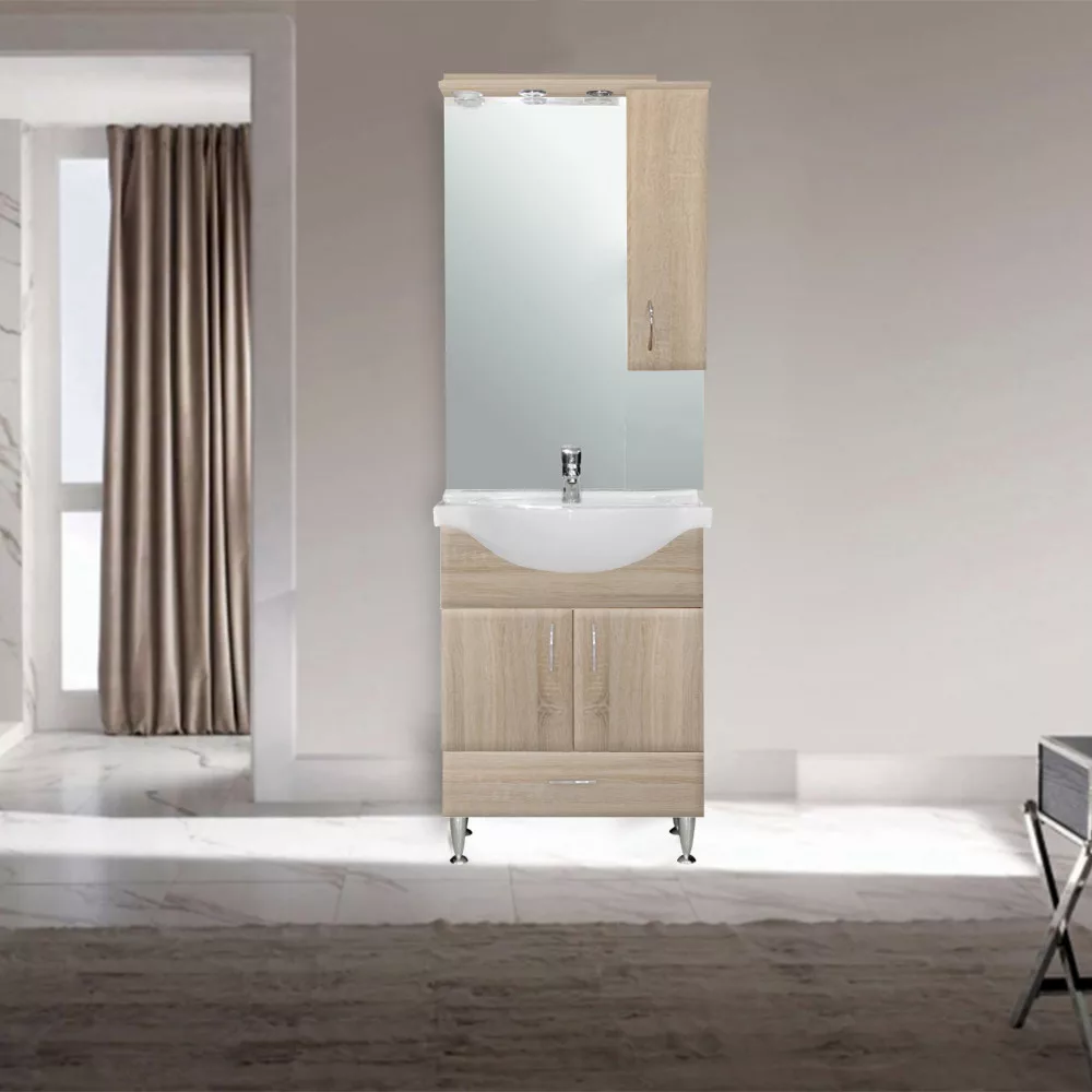 Oprócz funkcjonalności, dużą uwagę zwrócono oczywiście nawygląd mebla. Dzięki kolorowi dębu sonoma i klasycznym liniom tworzy harmonię w atmosferze każdej łazienki. Ze względu na materiał, z którego wykonane są meble (płyta meblowa), kolor boku korpusu może różnić się od koloru frontu wykonanego z płyty MDF o wysokim połysku.
