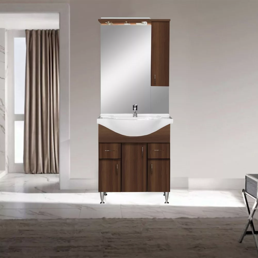 Oprócz funkcjonalności, dużą uwagę zwrócono oczywiście nawygląd mebla . Kolor orzecha Aida i klasyczne linie tworzą harmonię w atmosferze każdej łazienki. Ze względu na materiał, z którego wykonane są meble (płyta meblowa), kolor boku korpusu może różnić się od koloru frontu z płyty MDF o wysokim połysku.