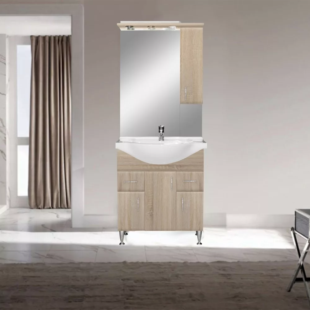 Oprócz funkcjonalności, dużą uwagę zwrócono oczywiście nawygląd mebla . Dzięki kolorowi dębu sonoma i klasycznym liniom tworzy harmonię w atmosferze każdej łazienki. Ze względu na materiał, z którego wykonane są meble (płyta meblowa), kolor boku korpusu może różnić się od koloru frontu wykonanego z płyty MDF o wysokim połysku.