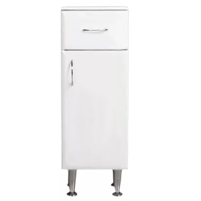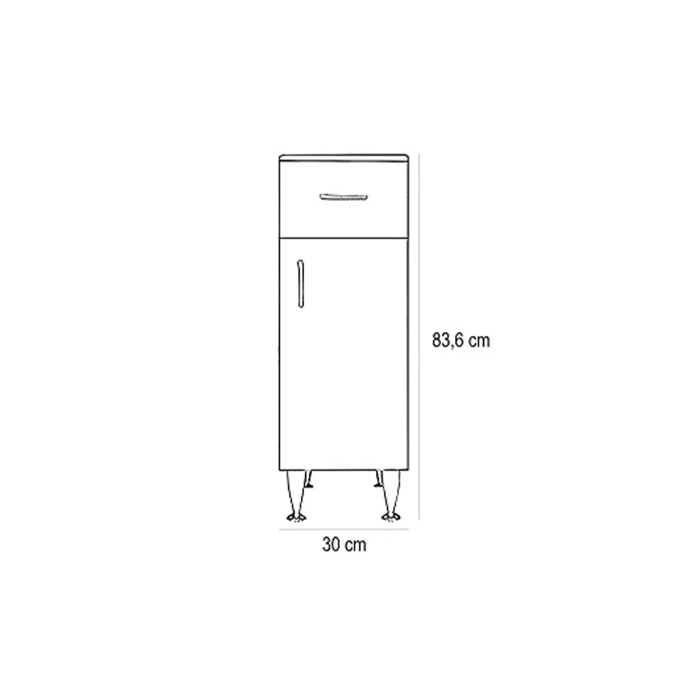 Mebel łazienkowy zajmuje niewiele miejsca, ale ma przestronny schowek , w którym można wygodnie przechowywać przybory toaletowe. Dzięki niewielkim rozmiaromnadaje się również do mniejszych łazienek, na przykład w mieszkaniach z prefabrykatów. Produkt jest wykonany z wysokiej jakości płyty meblowej i jest dostarczany z dopasowanymi kolorystycznie zamkami krawędziowymi.