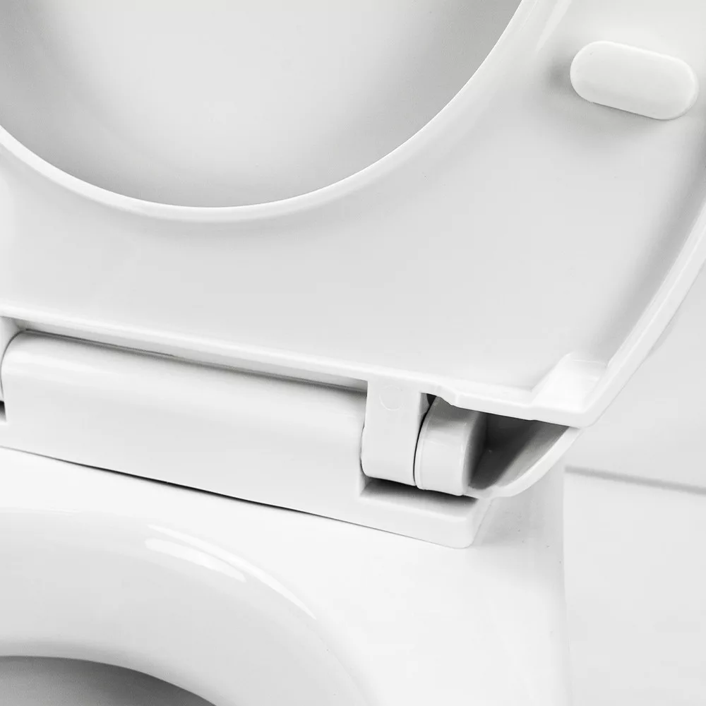 Deska sedesowa z tylną wylewką to praktyczny element toalety CLEANO. Tylna wylewka jest umieszczona blisko ściany i można ją łatwo podłączyć do odpowiedniego systemu odpływowego. Ergonomiczna konstrukcja siedziska zapewnia wygodną pozycję siedzącą, a łatwe otwieranie i zamykanie pokrywy ułatwia użytkowanie. Pokrywa jest wyposażona w mechanizm powolnego zamykania, który zapobiega nagłemu zatrzaśnięciu i zwiększa trwałość.