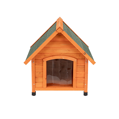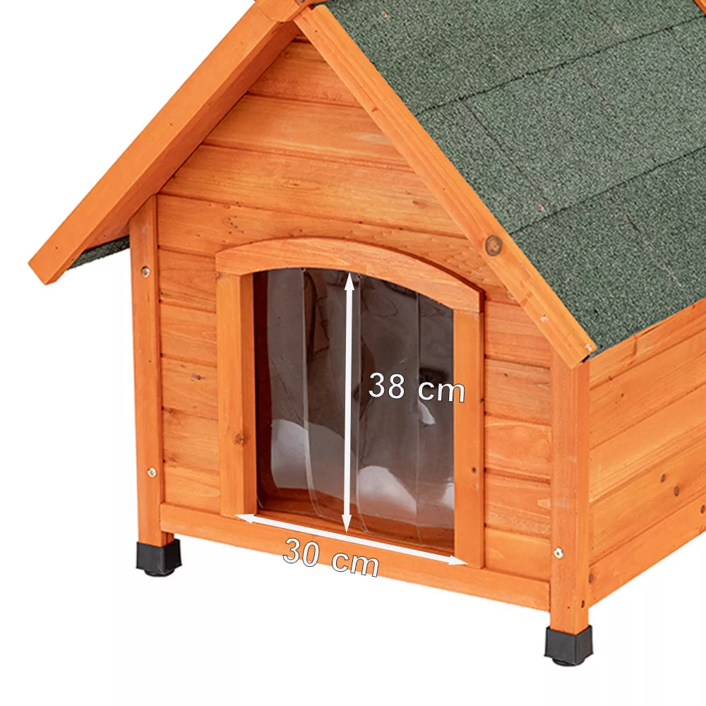 Dach budy dla psa pokryty jest papą z efektem cegły, aby zapewnić odporność na warunki atmosferyczne i dodatkową ochronę. Szerokie występy dachowe chronią przed deszczem, wiatrem i zimnem zarówno na zewnątrz, jak i przy wejściu. Przezroczyste drzwiczki żaluzjowe są idealne w deszczową pogodę i chronią przed przeciągami.
