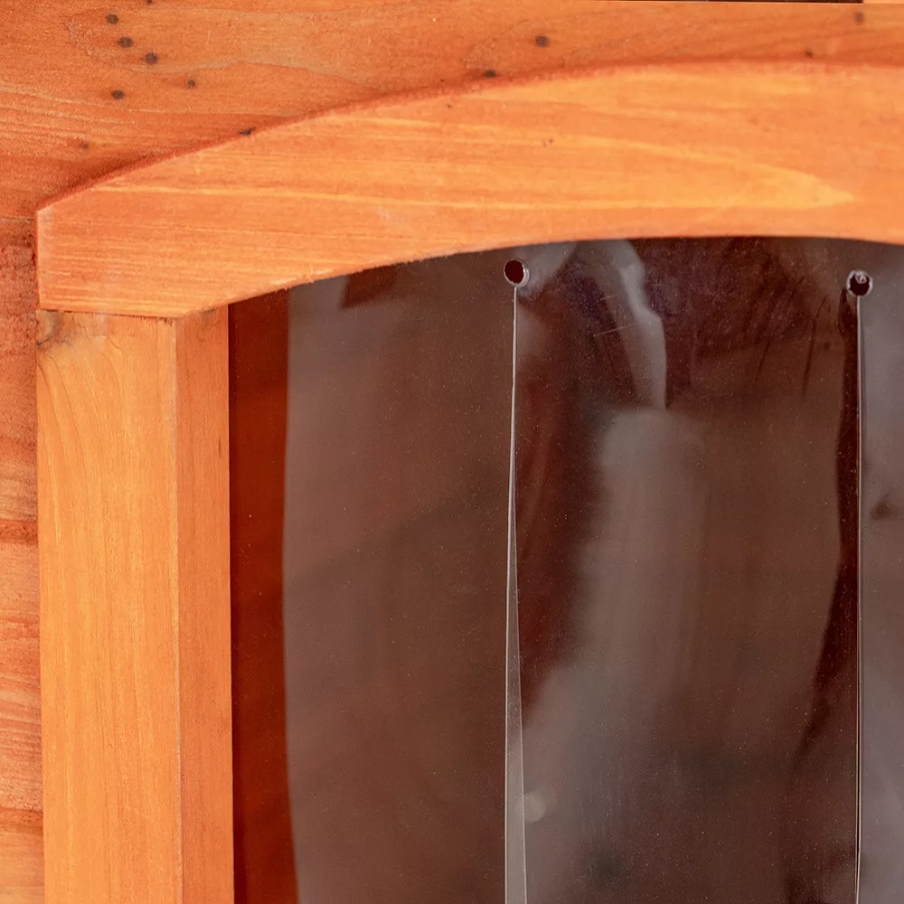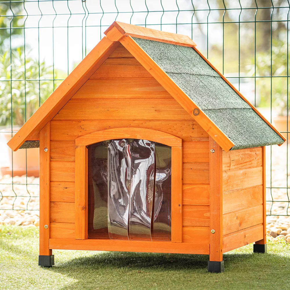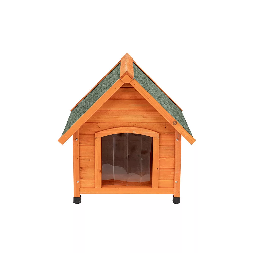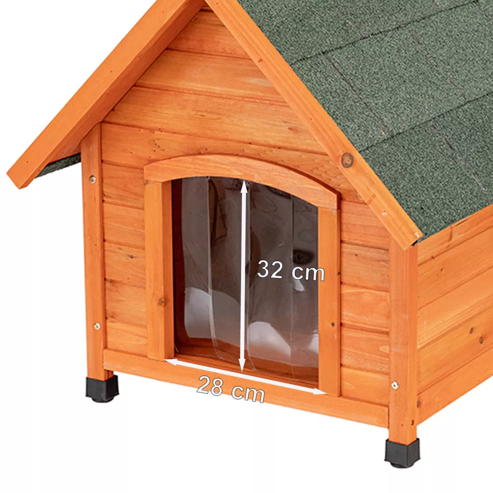 Dach budy dla psa jest pokryty papą z efektem cegły, aby zapewnić odporność na warunki atmosferyczne i dodatkową ochronę. Szerokie występy dachowe chronią przed deszczem, wiatrem i zimnem zarówno na zewnątrz, jak i przy wejściu. Przezroczyste drzwiczki żaluzjowe są idealne w deszczową pogodę i chronią przed przeciągami.