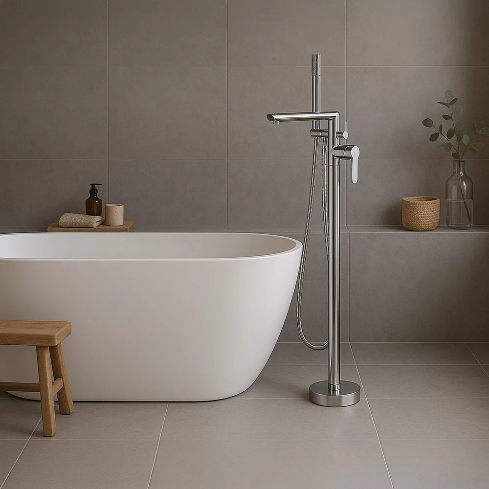 Konstrukcja montowana na podłodze zapewnia pełną swobodę w aranżacji łazienki, niezależnie od tego, czy wybierzesz wannę umieszczoną centralnie, czy rozwiązanie montowane na ścianie. Podstawa ze stali nierdzewnej o średnicy 15 cm i wysokości 5 cm zapewnia stabilną podstawę, a jednocześnie estetycznie wtapia się w płytki.