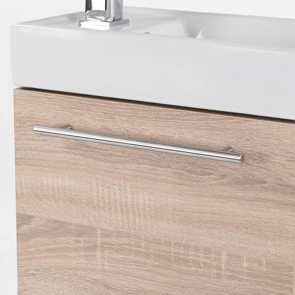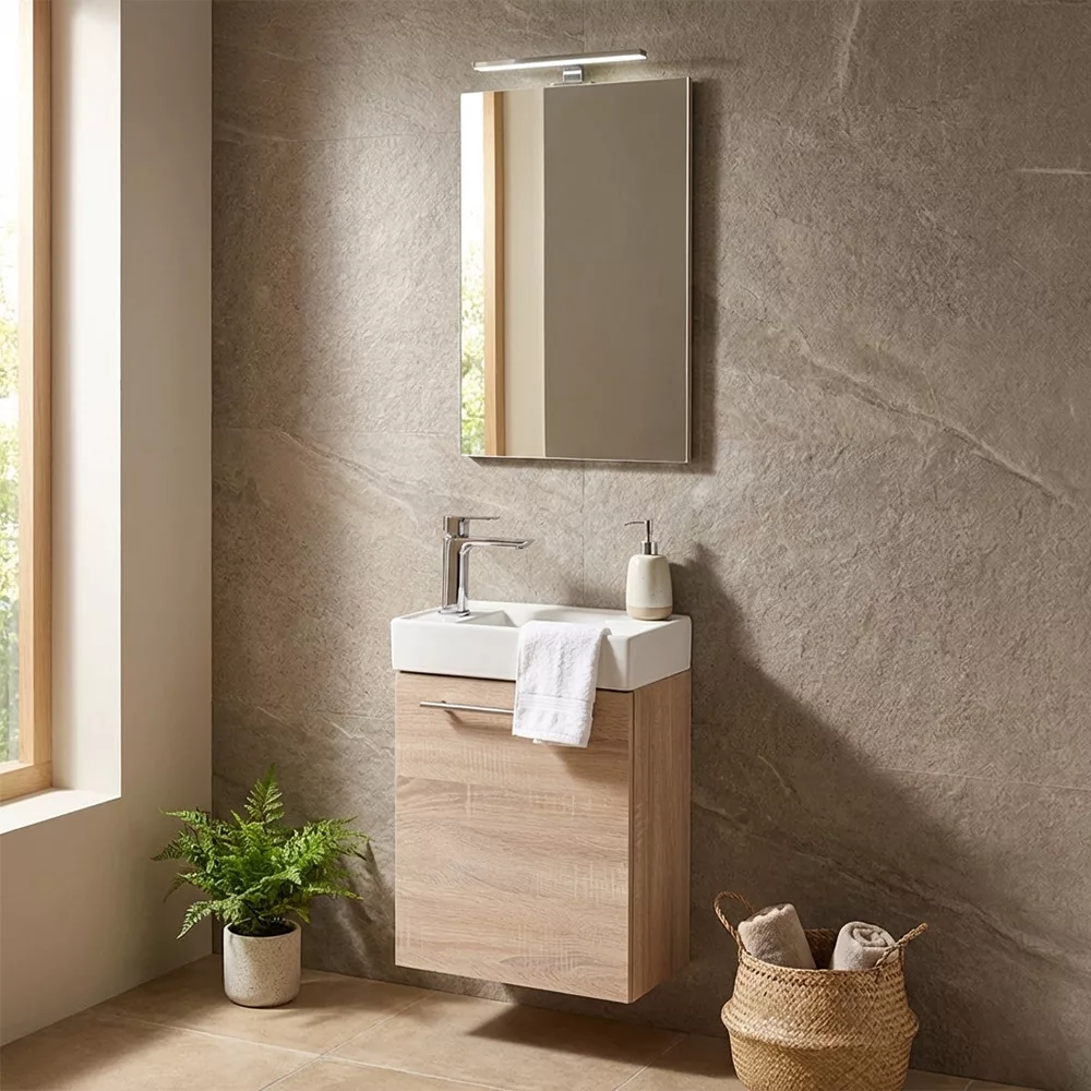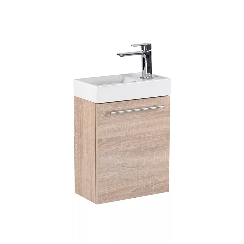 Wysokiej jakości meble łazienkowe o niewielkich rozmiarach do mniejszych łazienek lub toalet, idealne do mycia rąk. Produkt wykonany jest z wysokiej jakości płyty meblowej i wyposażony w dopasowane kolorystycznie zamki krawędziowe. Meble łazienkowe są dostępne w wykończeniu podwieszanym. Umywalka wykonana jest z białego marmuru.