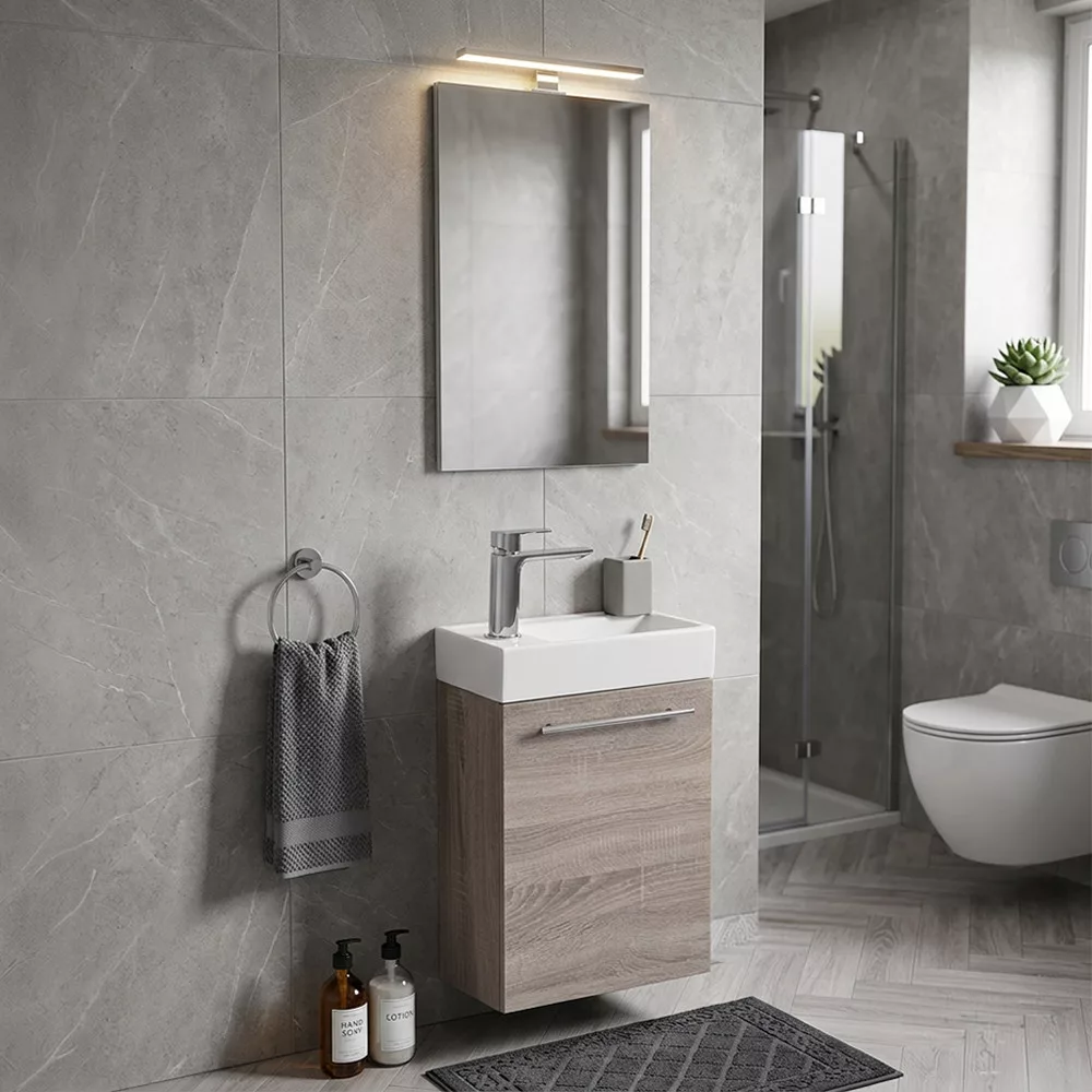 Kolor dąb yorki i jego czyste nowoczesne linie tworzą harmonię w atmosferze każdej łazienki.