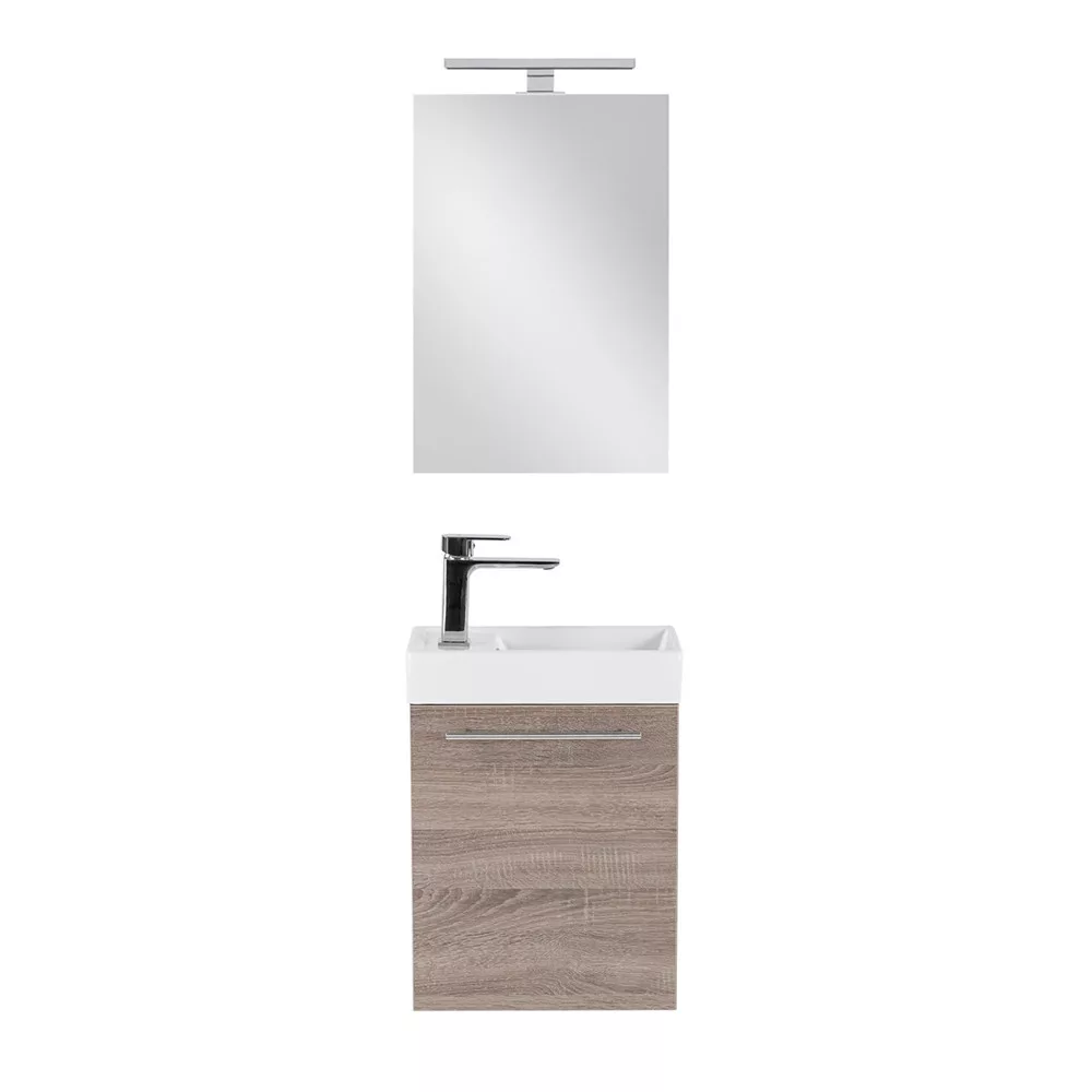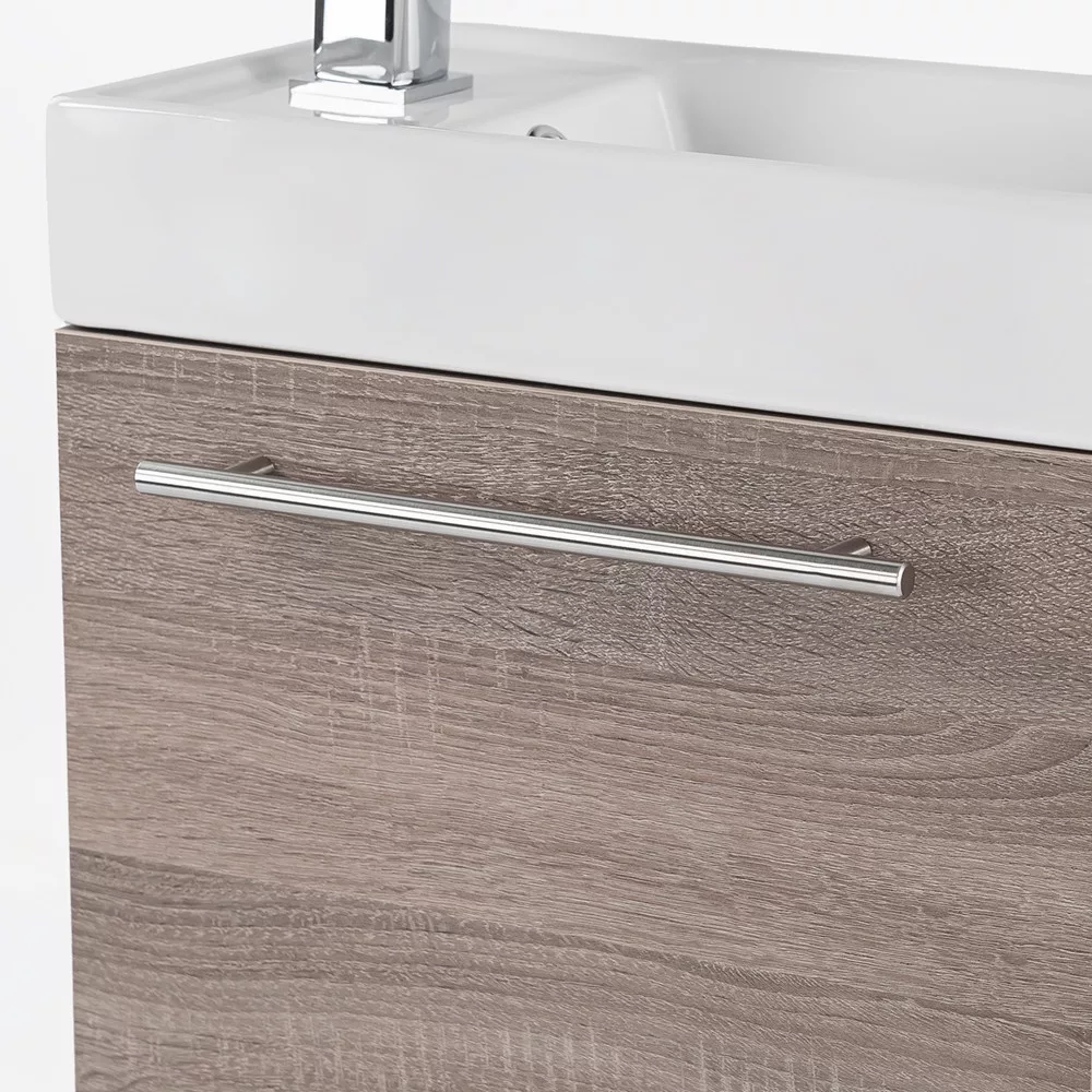 Wysokiej jakości meble łazienkowe o niewielkich rozmiarach do mniejszych łazienek lub toalet, idealne do mycia rąk. Produkt wykonany jest z wysokiej jakości płyty meblowej i wyposażony w dopasowane kolorystycznie zamki krawędziowe. Meble łazienkowe są dostępne w wykończeniu podwieszanym. Umywalka wykonana jest z białego marmuru.