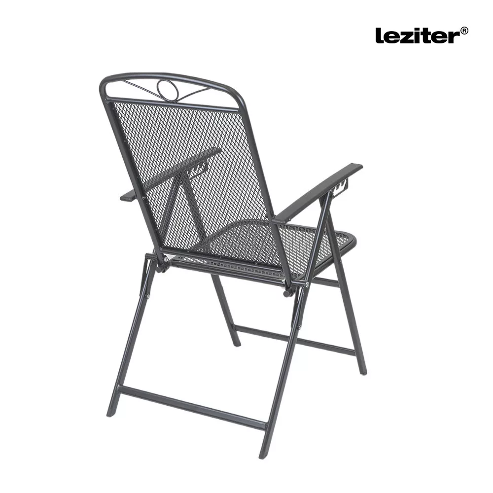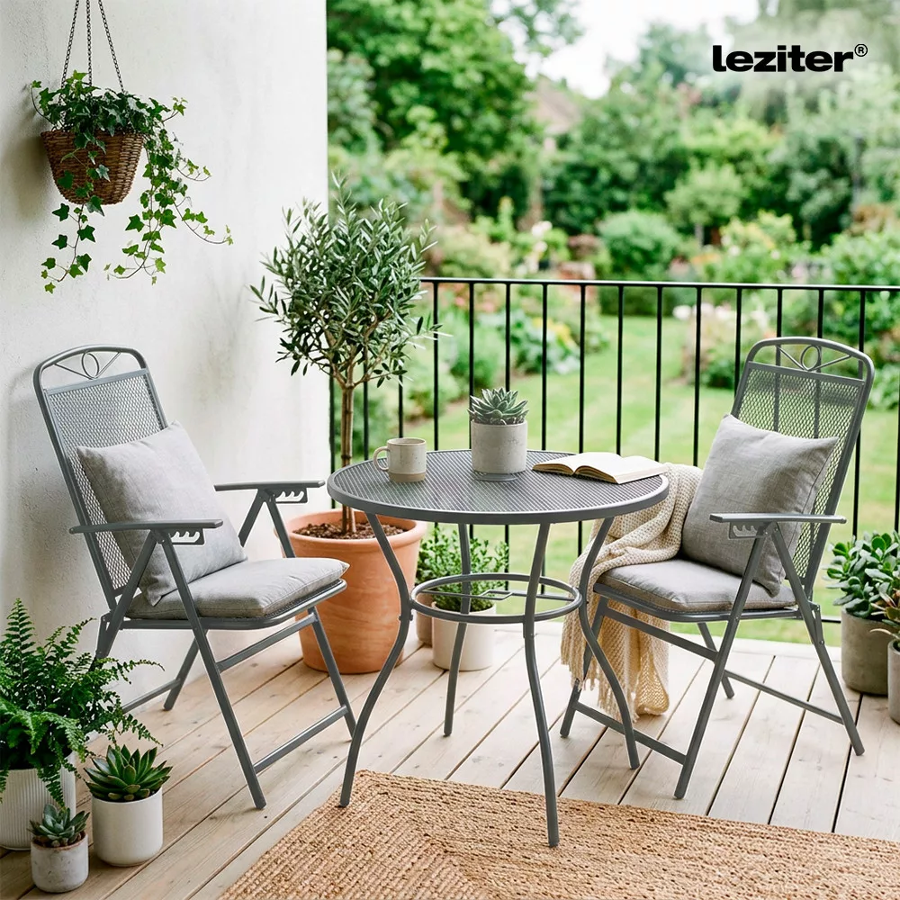 Zestaw mebli ogrodowych Leziter Elia Balcony w kolorze antracytowym obejmuje okrągły stół ogrodowy Arko i 2 składane krzesła ogrodowe Alba, a dzięki solidnej stalowej konstrukcji, odpornemu na korozję i malowanemu proszkowo wykończeniu oraz kompaktowej konstrukcji jest idealnym wyborem na balkon, mały taras lub do ogrodu.