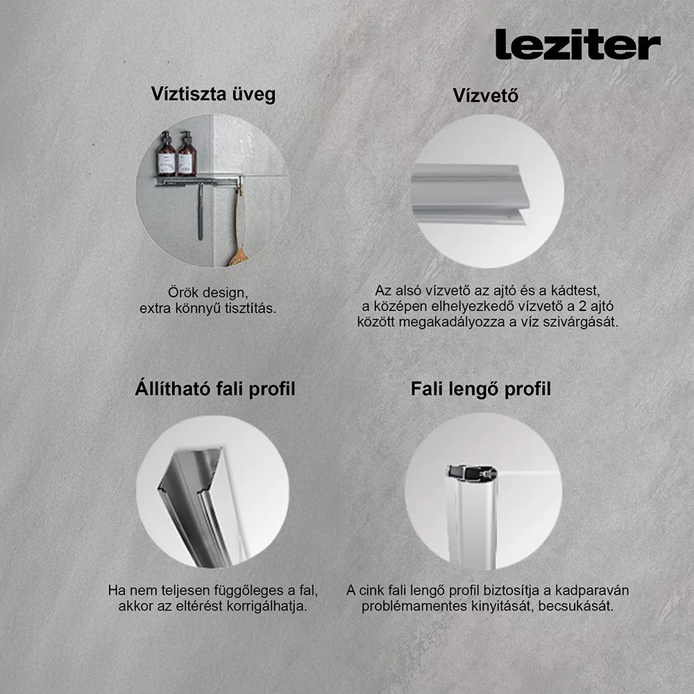 - Fix kádparaván: A másik oldalon nyitott rész marad, így minimális víz kifröccsenhet, amit a zuhanyfej helyes irányításával lehet csökkenteni.