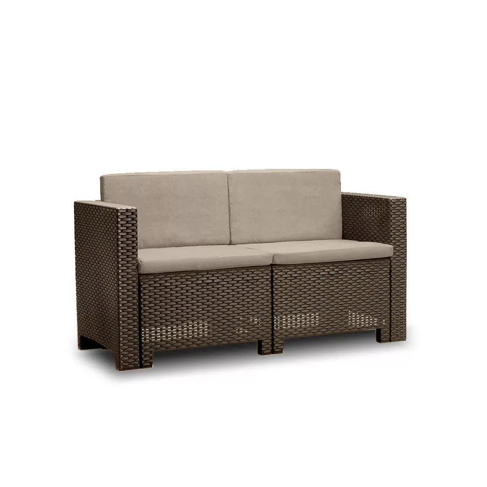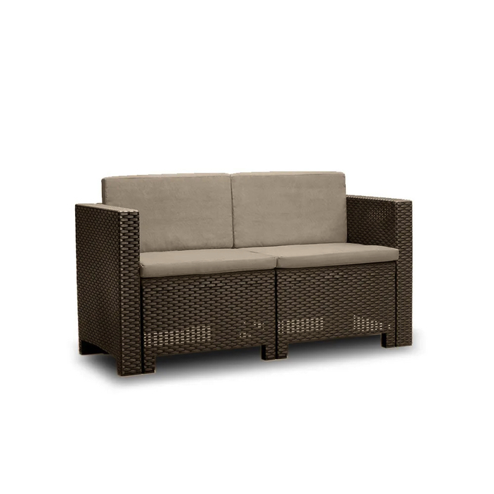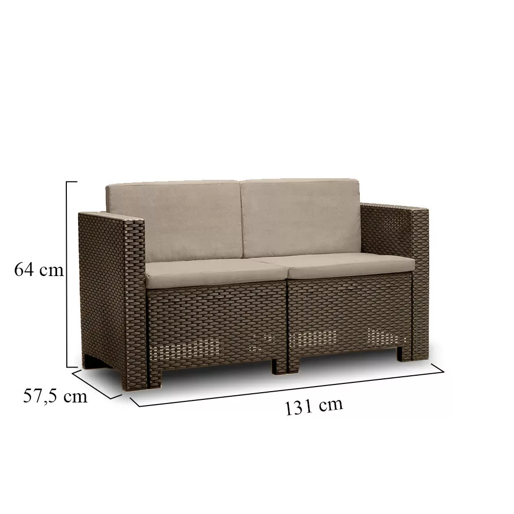 Sofa o wymiarach 57,5 x 64 x 131 cm nadaje się zarówno do użytku wewnętrznego, jak i zewnętrznego, ponieważ jest odporna na warunki atmosferyczne. Może być ważnym elementem wyposażenia ogrodu lub patio, oferując miejsce do siedzenia dla dwóch osób, z wygodnymi poduszkami w dopasowanych kolorach. Praktyczne, solidne, wytrzymałe i wyjątkowo estetyczne meble sprawdzą się zarówno w lokalach prywatnych, jak i komercyjnych (np. restauracjach, hotelach, kawiarniach).