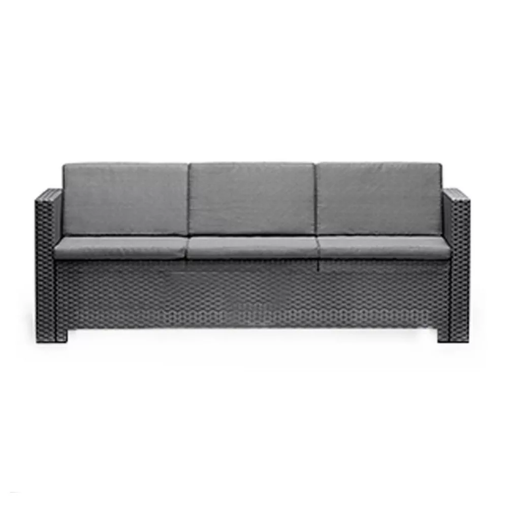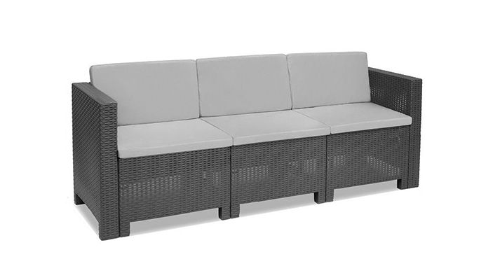 Trzyosobowa sofa ogrodowa City z poduszkami jest oferowana w komplecie z poduszkami. Ta duża wygodna sofa o wymiarach 57 x 64 x 188 cm wygląda idealnie w każdym otoczeniu, a grafitowy kolor i oryginalne wykończenie przypominające rattan można dopasować do wielu stylów wnętrz. Mebel wykonany jest zodpornego na promieniowanie UV i warunki atmosferyczne tworzywa sztucznego , dzięki czemu stanowi ponadczasowy, trwały wybór. Są również niezwykle łatwe w czyszczeniu i jeszcze łatwiejsze w montażu.