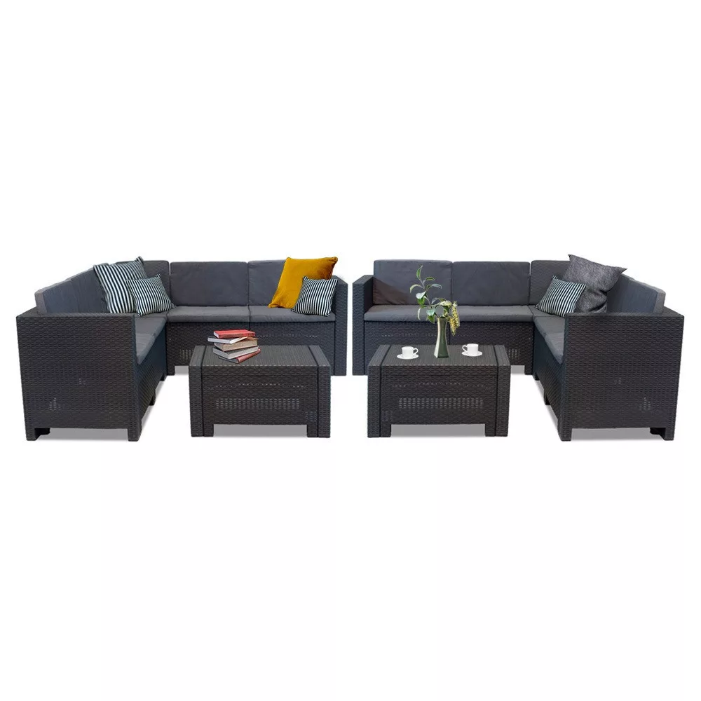 Nagy befogadóképesség: A két öt személyes kanapéból és két négyszögletes asztalból álló kerti bútor szett kényelmes helyet biztosít 10 fő számára. Nagyszerű lehetőség baráti összejövetelekre, családi vacsorákra és grillezésekhez.
