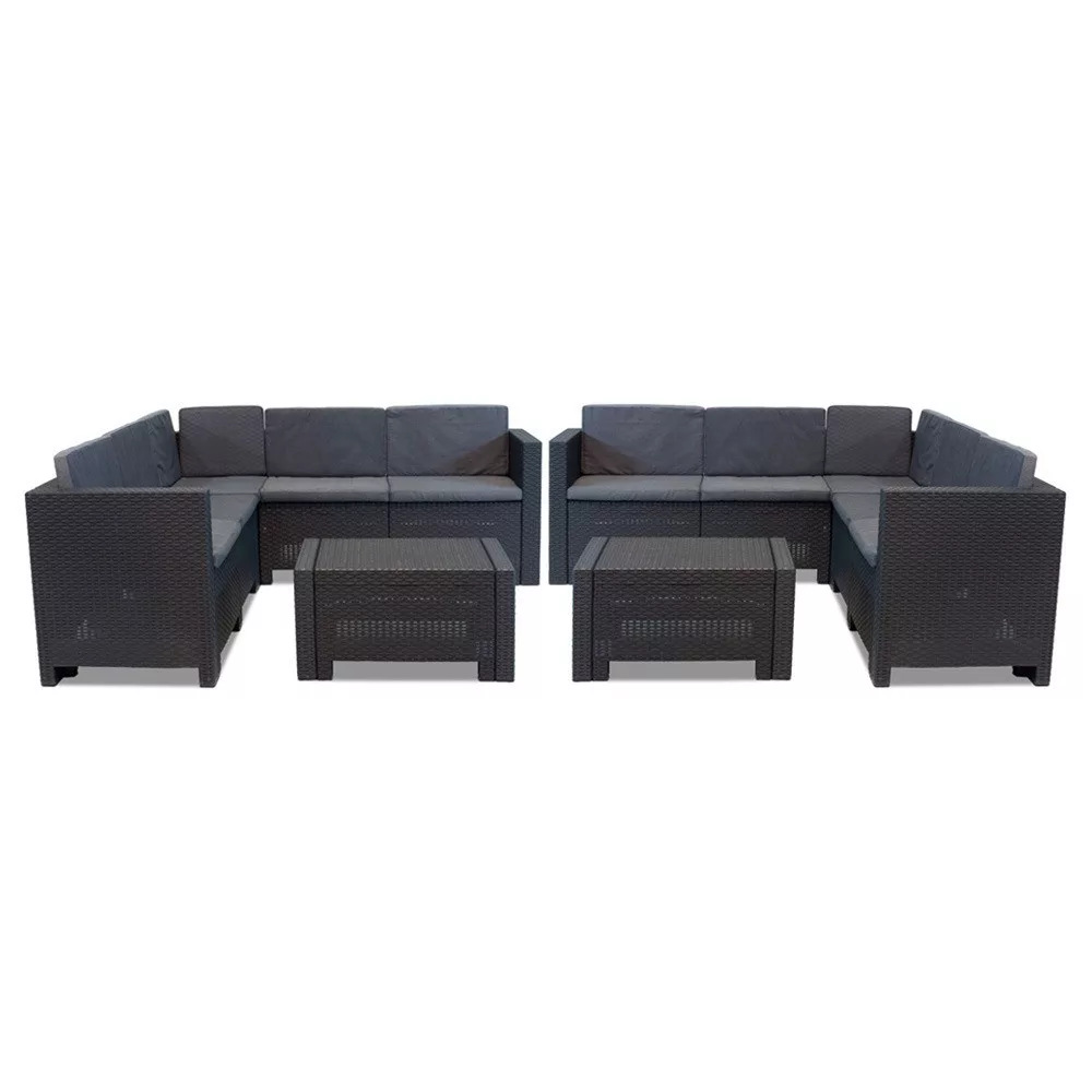 Az Olaszországban gyártott City Large 10 személyes sarok kerti bútor garnitúra kiváló választás azoknak, akik szeretnének egy stílusos és kényelmes helyet a szabadban való időtöltésre. A garnitúra elegáns grafit színben pompázik, és két darab 57,5 x 64 x 188 x 180 cm-es öt személyes sarok kanapét és két darab 37 x 48 x 69,5 cm-es négyszögletes asztalt tartalmaz. Ez az 10 személyes kerti bútor szett elegendő helyet biztosít az egész családnak, hogy kényelmesen és stílusosan élvezhessék a kertet és a teraszt. Az időjárásálló műanyagból készült bútorok tartósak és könnyen összeszerelhetők. A rattan hatású kivitel pedig modern megjelenést kölcsönöz a teraszoknak és kerteknek.