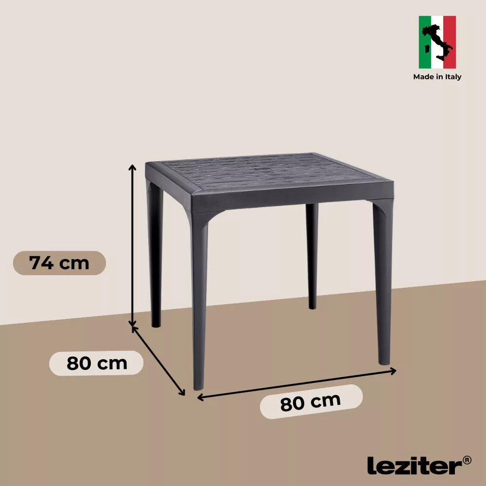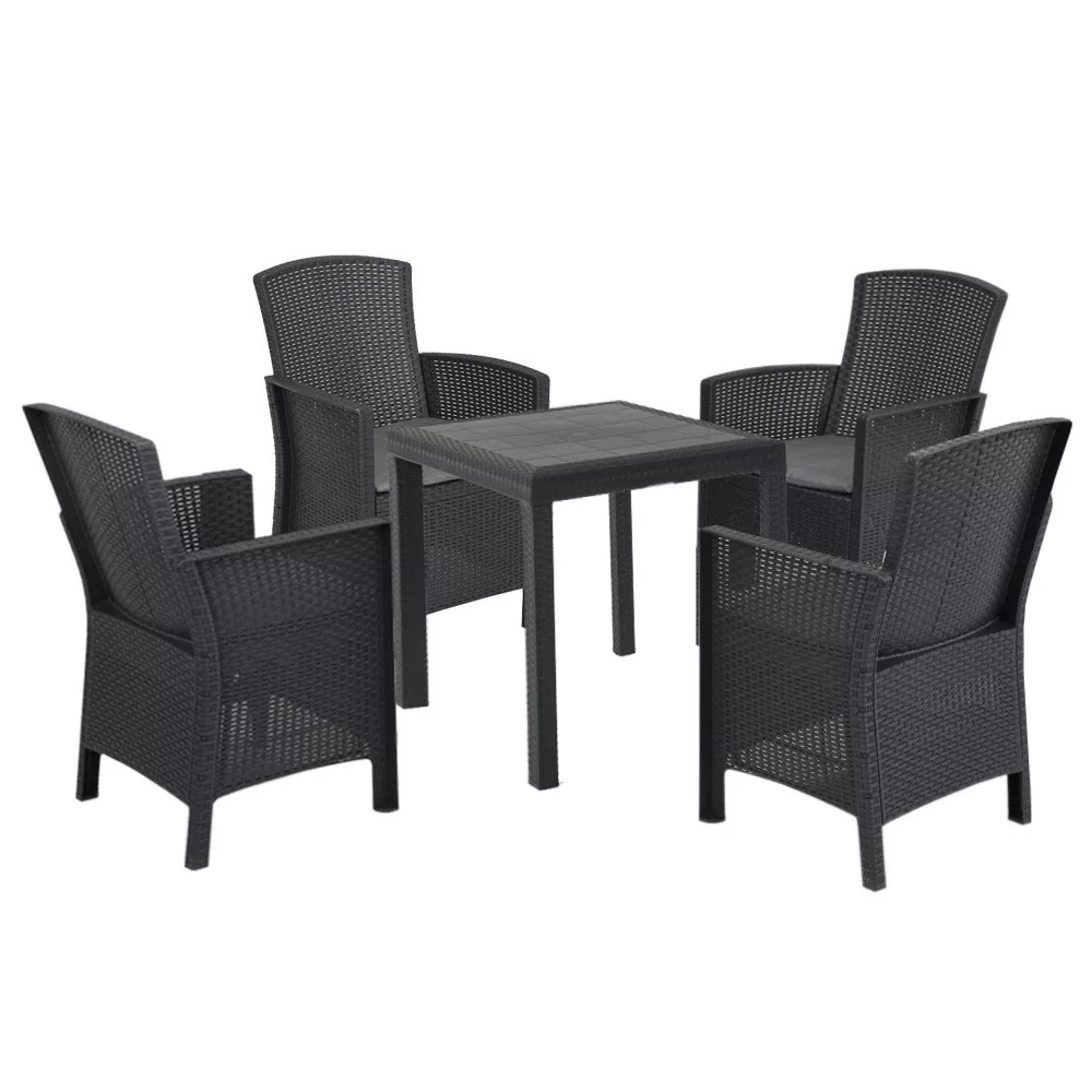 Ten grafitowy, wygodny i stylowy zestaw mebli Dima składa się z czterech krzeseł o wymiarach 60 x 56 x 90 cm i jednego prostokątnego stołu o wymiarach 80 x 80 x 74 cm. Dzięki swojej konstrukcji jest łatwy do przenoszenia, a jednocześnie bardzo stabilny i zapewnia wygodne siedzenia. Wykonany jest z tworzywa sztucznego odpornego na warunki atmosferyczne i promieniowanie UV. Jest łatwy w montażu i nie wymaga wiedzy technicznej.