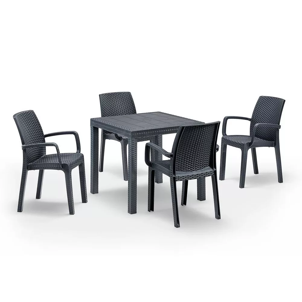 Ez a grafit színű, kényelmes és elegáns Petri bútor szett négy 57x 59x 86 cm-es széket és egy 80x 80x 74 cm-es négyszögletes magas asztalt foglal magába. Ez az 4 személyes kerti bútor szett elegendő helyet biztosít az egész család számára, hogy a szabad levegőn tudjátok tölteni az időt. Nagyszerű választás ha napközben szeretsz az udvaron pihenni és olvasgatni. Alkalmas családi összejövetelekhez. Ez a szett minden udvart és teraszt színesebbé tesz modern megjelenésével.