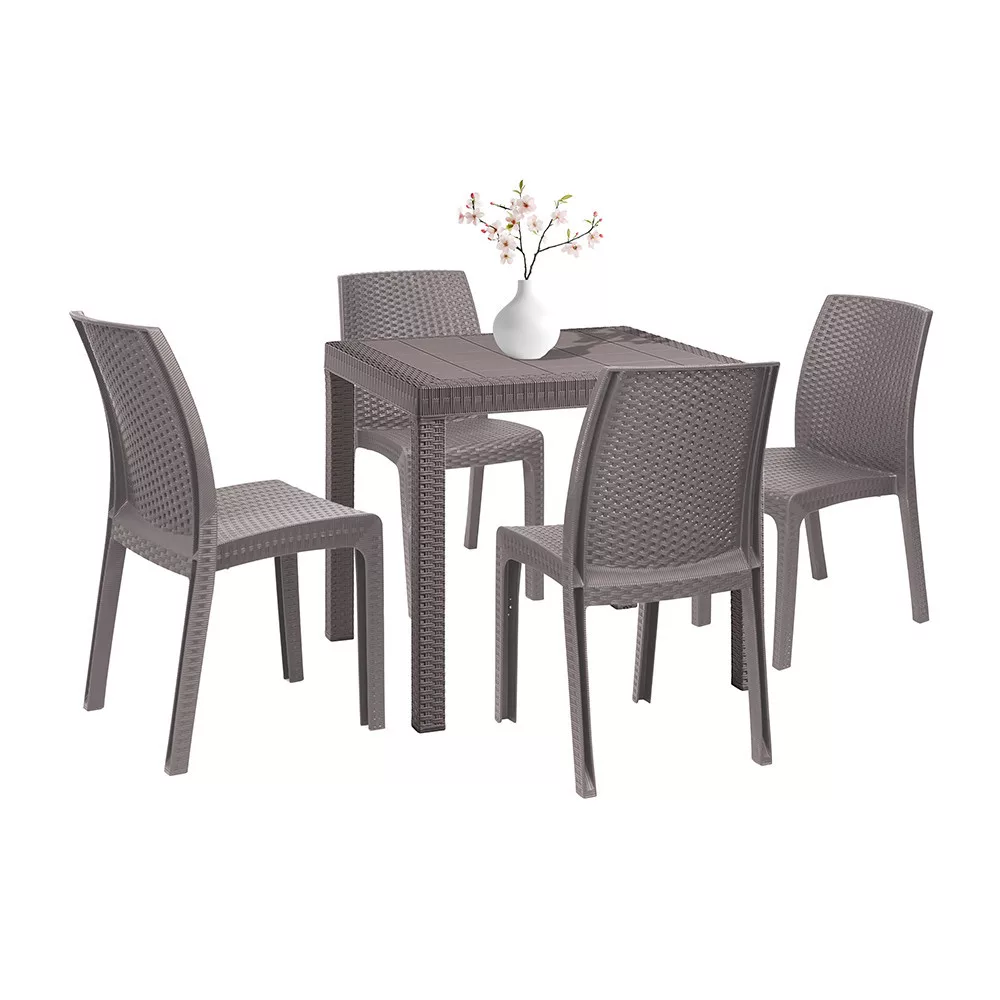 A szett központi eleme a Diana műanyag kerti asztal, amely 80x80 cm-es méretével akár 4 fő számára is kényelmes étkezési vagy társalgási lehetőséget kínál.