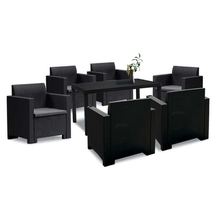 Wyprodukowany we Włoszech, wygodny i elegancki zestaw mebli w kolorze grafitowym obejmuje sześć krzeseł o wymiarach 57,5x 75x 79 cm i jeden prostokątny stół o wymiarach 74x 90x 150 cm. Ten 6-częściowy zestaw mebli ogrodowych zapewnia wystarczająco dużo miejsca, aby cała rodzina mogła siedzieć jak w salonie, a jednocześnie spędzać czas na świeżym powietrzu. Jest to również świetny wybór, jeśli lubisz relaksować się i czytać na podwórku w ciągu dnia, rozłożony na sofie. Nadaje się do spotkań rodzinnych i wydarzeń biznesowych, ponieważ przekształcakażdą przestrzeń w nowoczesną i przytulnąprzestrzeń.