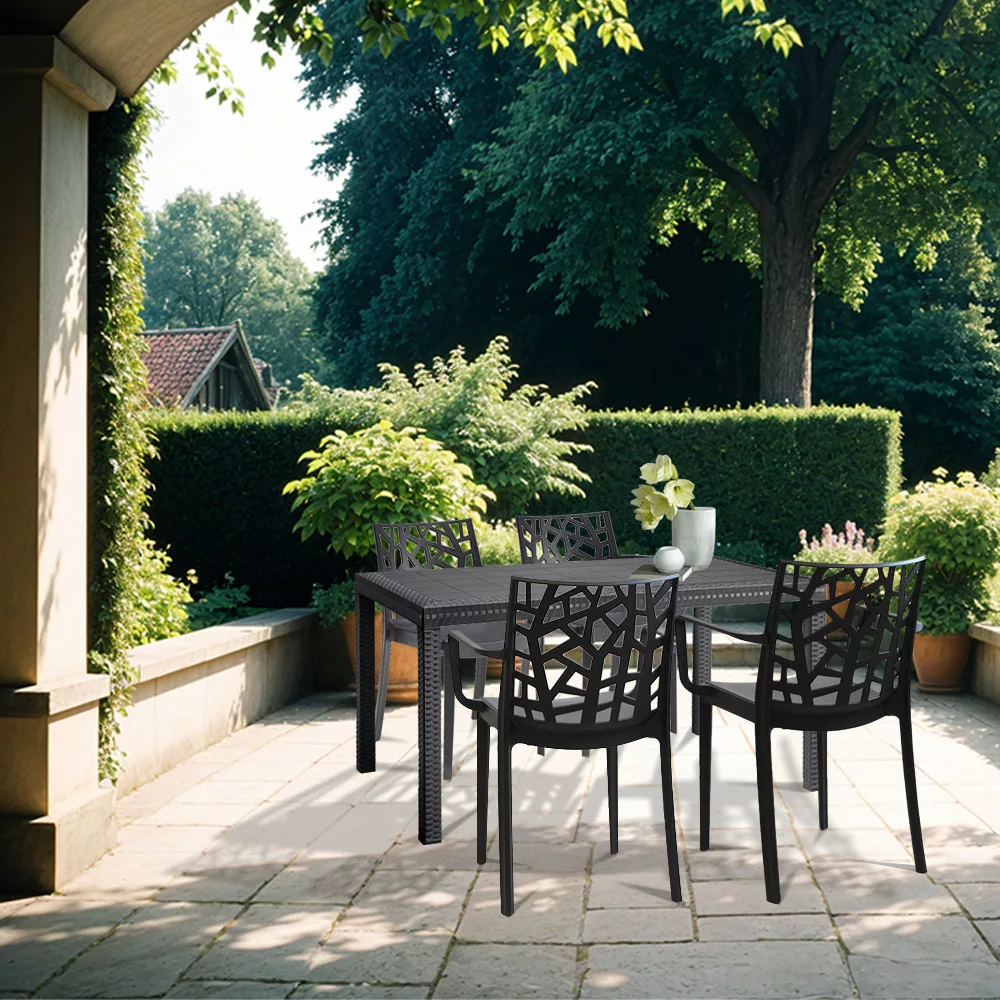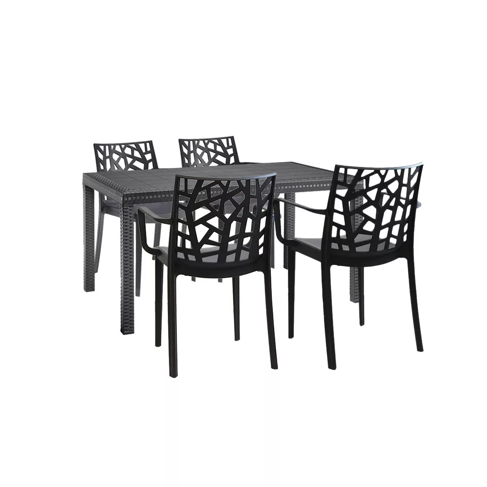 Ez a grafit színű, kényelmes és elegáns Violina bútor szett négy 55x 58x 82cm-es karfás széket és egy 90x 150x 74 cm-es négyszögletes magas asztalt foglal magába. Ez a 4 személyes kerti bútor garnitúra elegendő helyet biztosít az egész család számára, hogy a szabad levegőn tudjátok tölteni az időt. Nagyszerű választás, ha napközben szeretsz az udvaron pihenni és olvasgatni. Alkalmas családi összejövetelekhez.