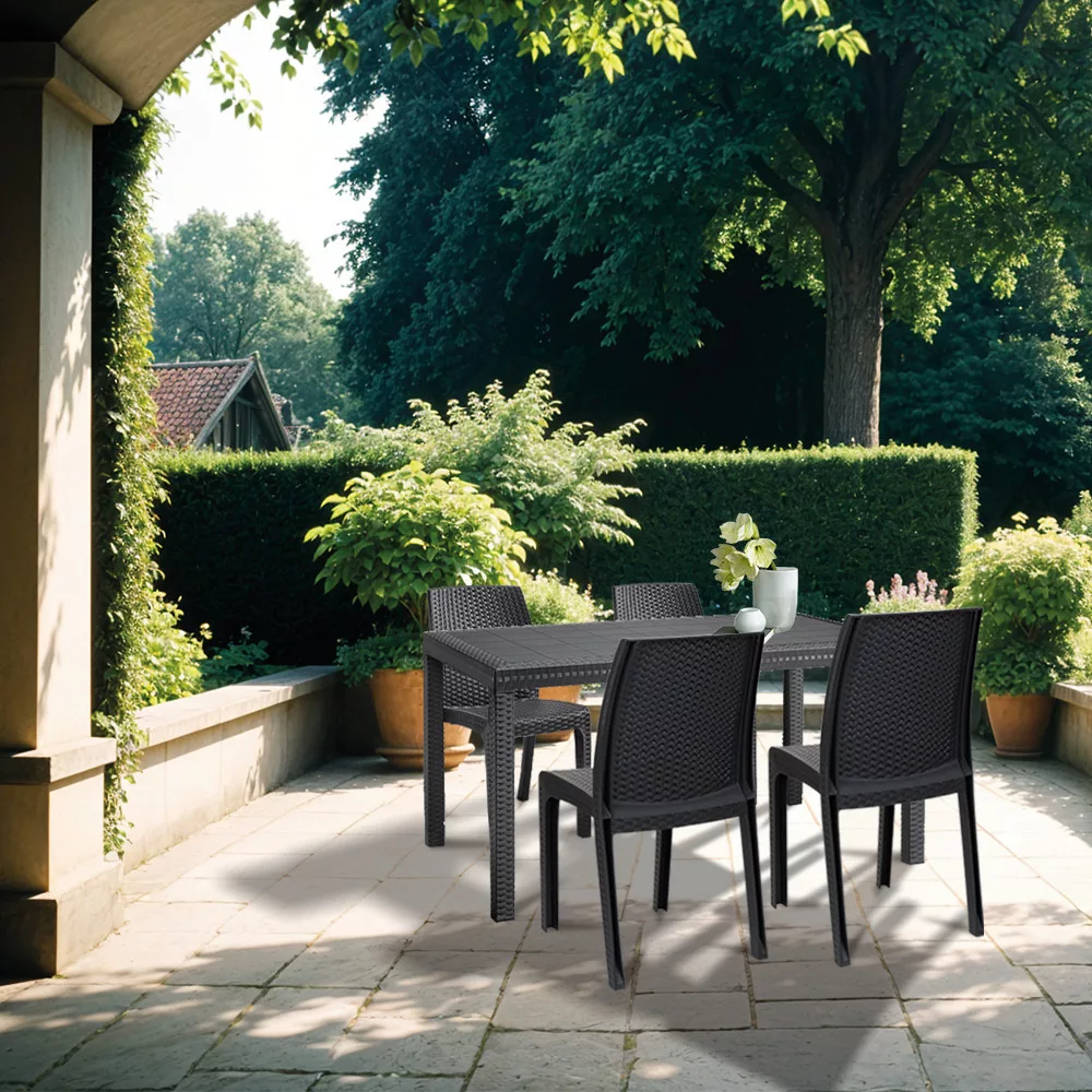 Ez a grafit színű, kényelmes és elegáns Hellda bútor szett négy 47x 59x 86 cm-es széket és egy 90x 150x 74 cm-es négyszögletes magas asztalt foglal magába. Ez az 4 személyes kerti bútor szett elegendő helyet biztosít az egész család számára, hogy a szabad levegőn tudjátok tölteni az időt. Nagyszerű választás,ha napközben szeretsz az udvaron pihenni és olvasgatni. Alkalmas családi összejövetelekhez. Ez a szett minden udvart és teraszt színesebbé tesz modern megjelenésével.