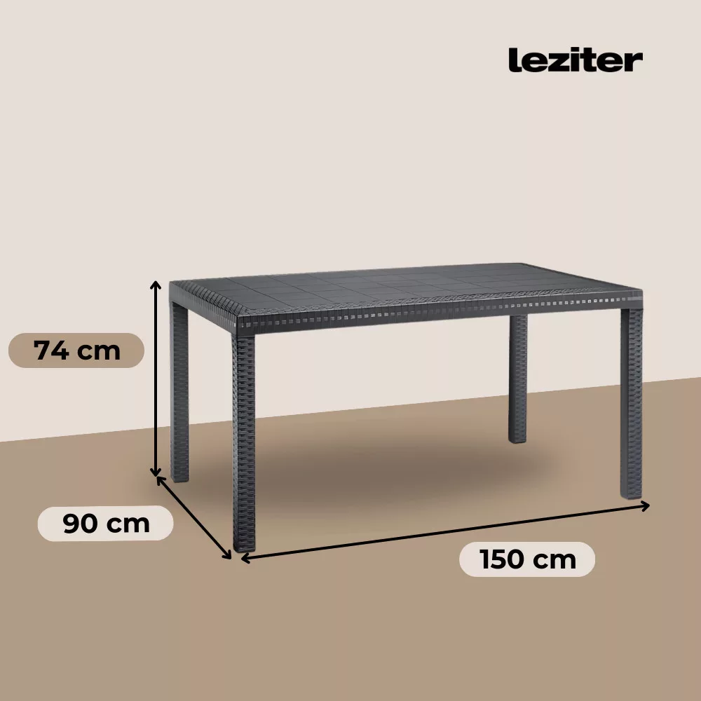 Wyprodukowany we Włoszech, grafitowy, wygodny i stylowy prostokątny stół z rattanu o wymiarach 150 x 90 x 74 cm. Wykonany z tworzywa sztucznego odpornego na warunki atmosferyczne, może być również umieszczony przy basenie. Ten ponadczasowy mebel będzie wyglądał jak nowy przez wiele lat. Łatwy w montażu, nie wymaga profesjonalnej wiedzy.