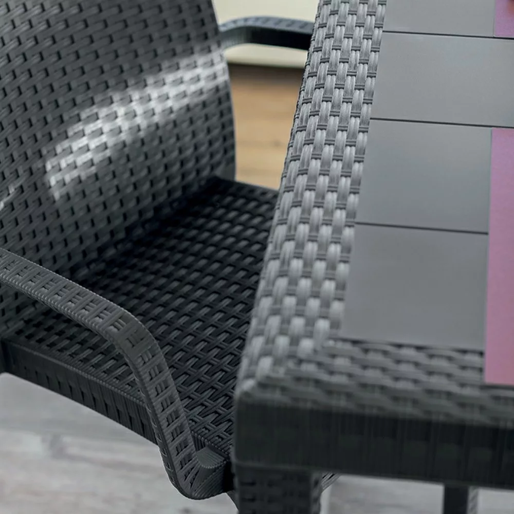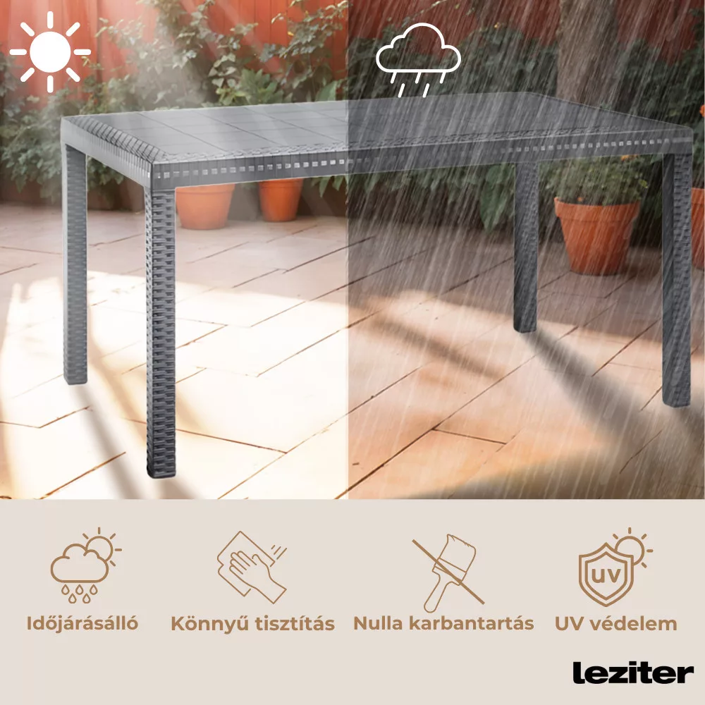 Trwały materiał: wykonany z tworzywa sztucznego odpornego na promieniowanie UV i warunki atmosferyczne. Stół idealnie sprawdzi się w każdej przestrzeni wokół domu, gdzie stworzy idealne miejsce do relaksu na świeżym powietrzu. Jego wykończenie inspirowane nowoczesnym stylem to jedna z zalet estetycznych tego produktu.