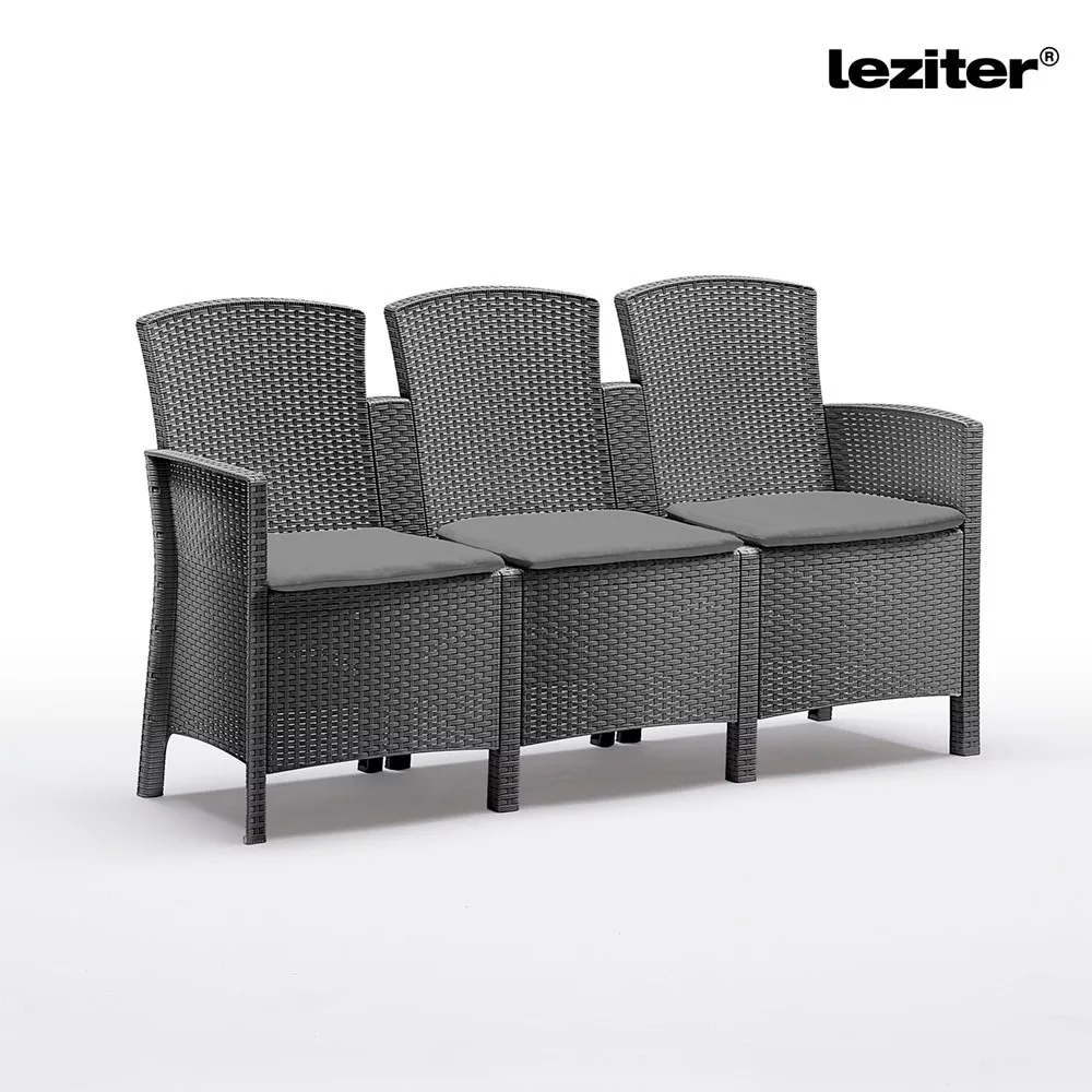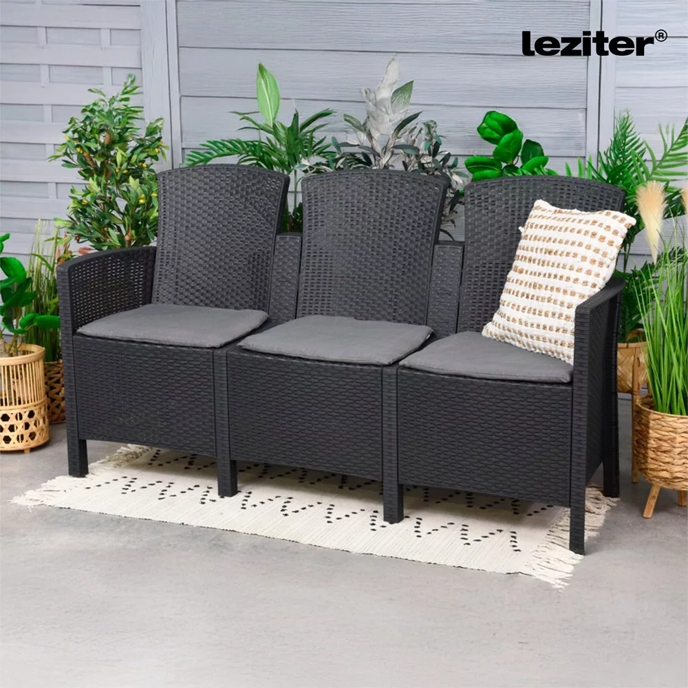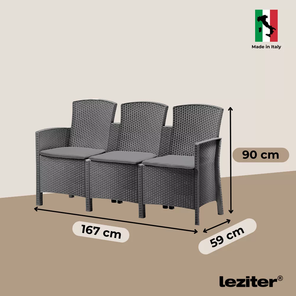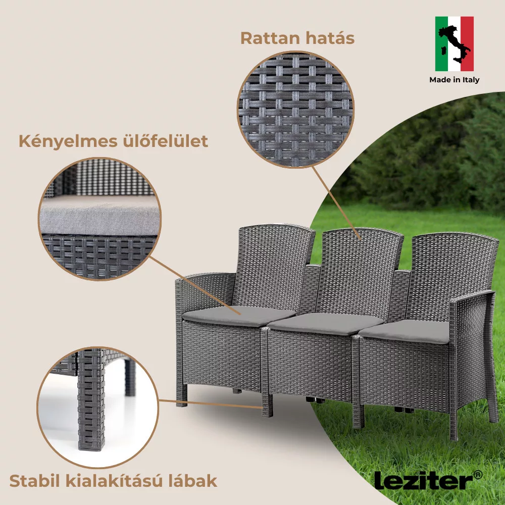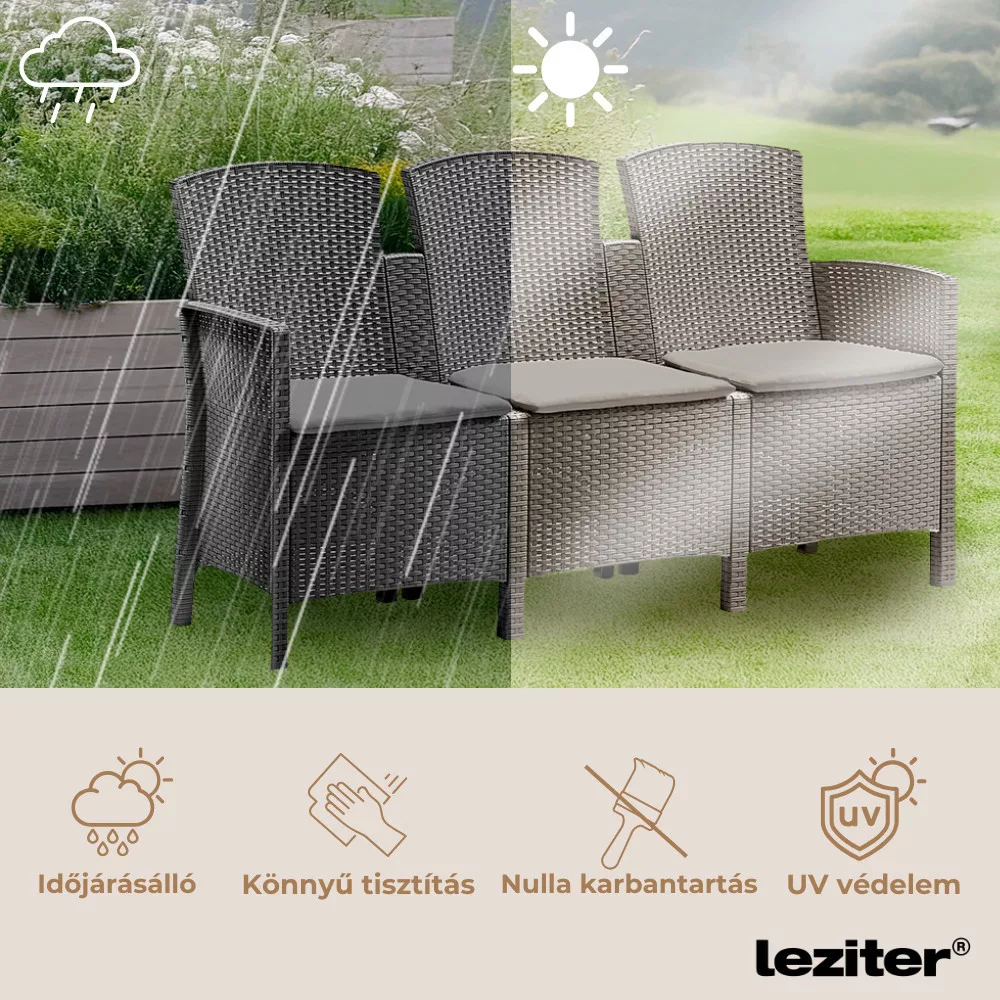 Grafitowy kolor i oryginalna tekstura z efektem rattanu sprawiają, że sofa ta bez trudu pasuje do nowoczesnych i klasycznych ogrodów, patio, a nawet restauracji. Jej kompaktowy rozmiar (167 x 59 x 90 cm) sprawia, że świetnie prezentuje się na mniejszych tarasach, zapewniając jednocześnie wystarczająco dużo miejsca do wygodnego siedzenia.