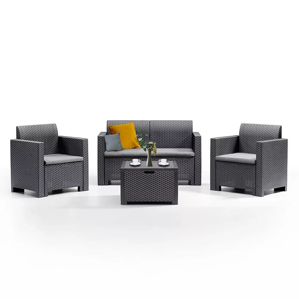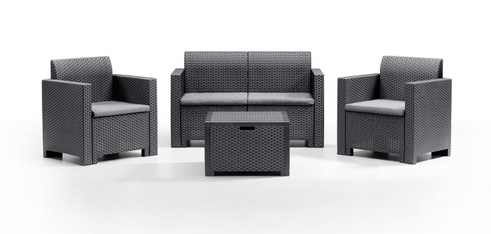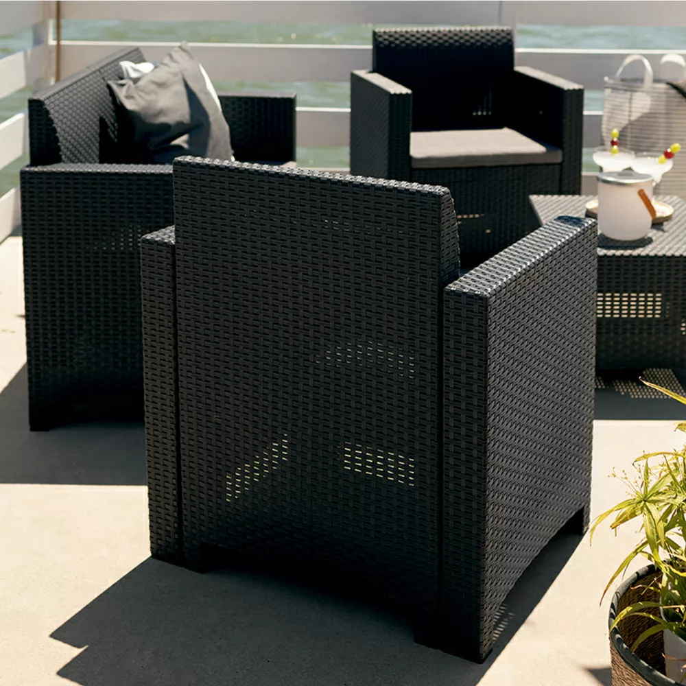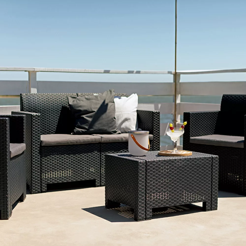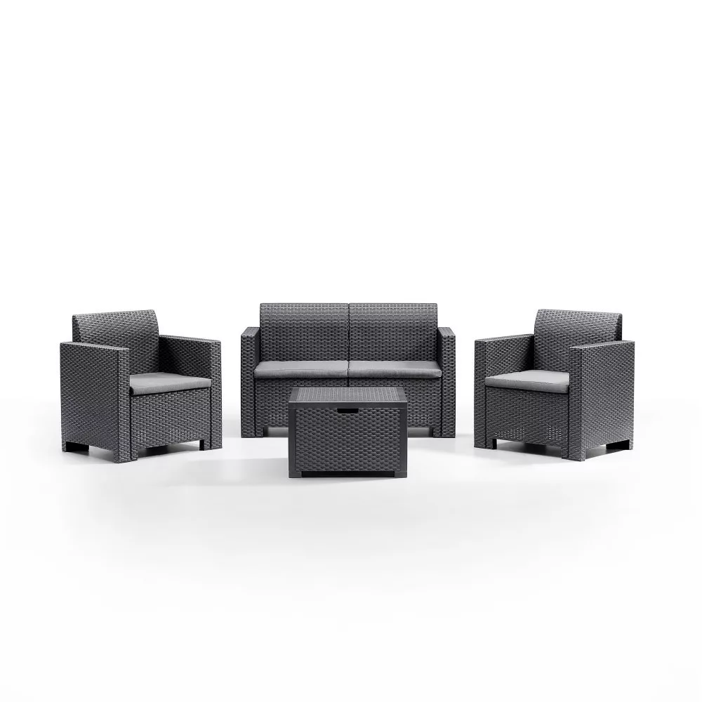 Dostępny w odcieniach grafitu zestaw posiada szare poduszki, które zapewniają maksymalny komfort, a jednocześnie wyglądają modnie i przyciągają wzrok. Meble wykonane są z mocnego i trwałego tworzywa sztucznego, które w dużej mierze pochodzi z recyklingu, co czyni je bardziej zrównoważonym rozwiązaniem.