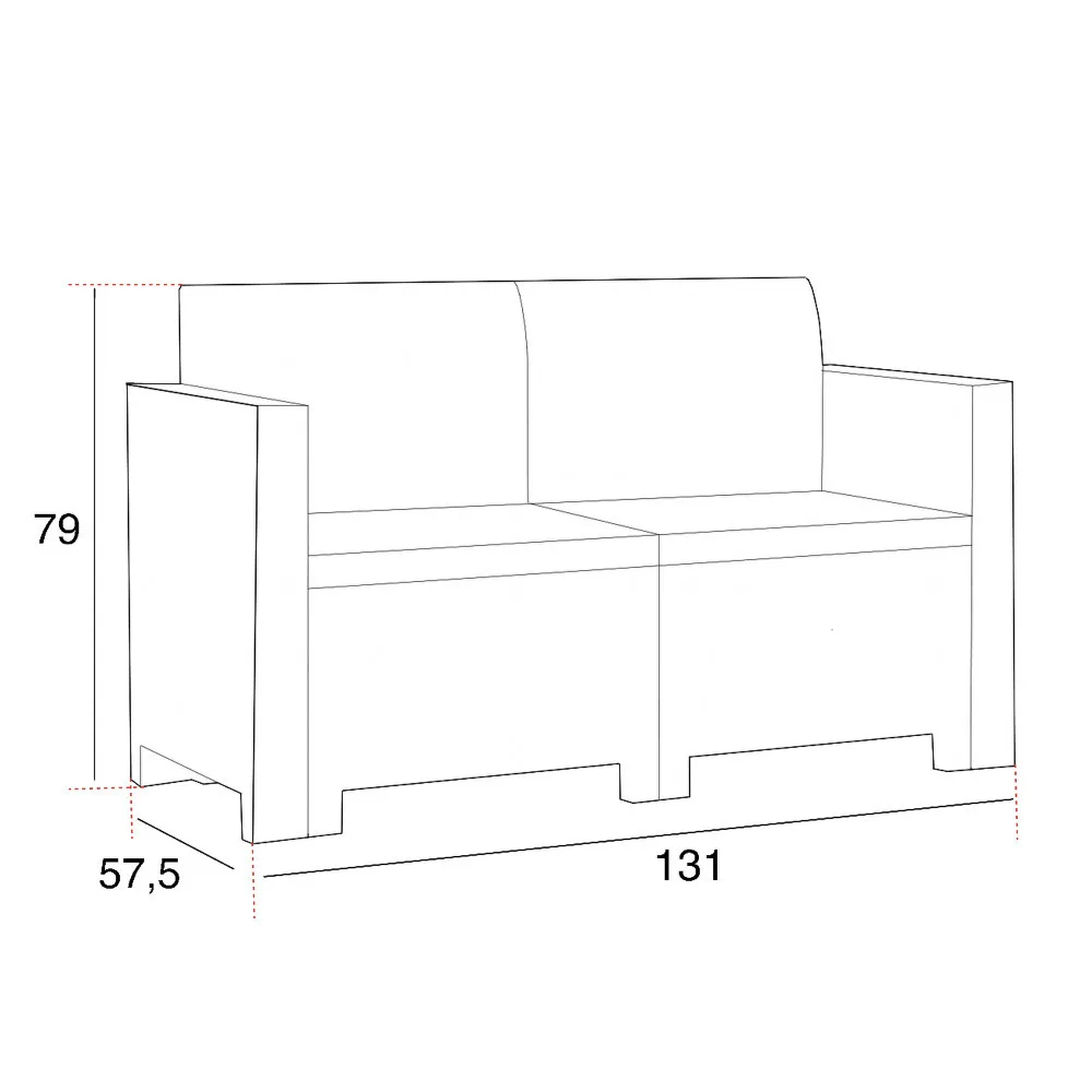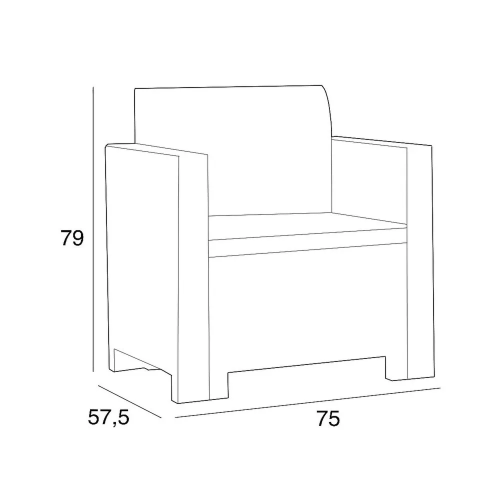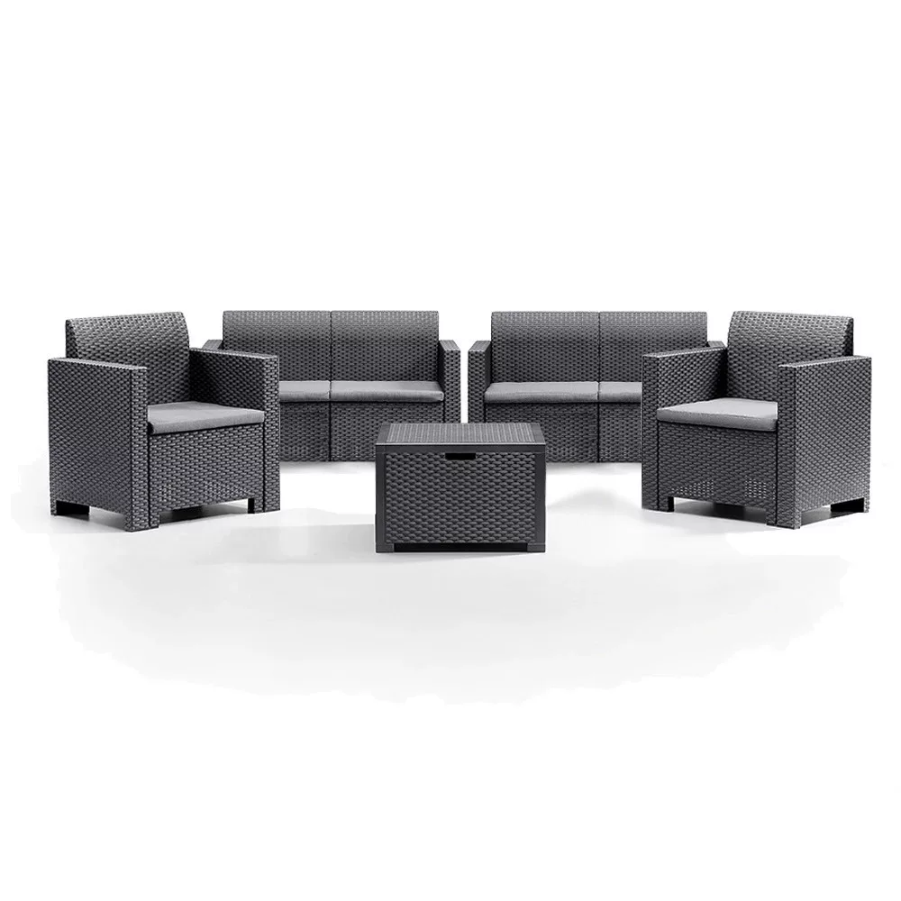 Ez az olasz grafit színű, kényelmes és elegáns bútor szett két 57,5x 75x 79 cm-es fotelt, kettő 57,5x 79x 131 cm-es két személyes kanapét és egy 40x 64x 64 cm-es négyszögletes asztalt foglal magába. Ez a 6 személyes kerti bútor garnitúra elegendő helyet biztosít a család számára és olyan mintha a nappaliban ülnének, mégis a szabad levegőn tudják tölteni az időt. Nagyszerű választás akkor is, ha napközben szeretsz az udvaron pihenni és olvasgatni, elterülve egy kanapén. Alkalmas családi összejövetelekhez, üzleti rendezvényekhez, mert minden teret moderné és hangulatossá változtat megjelenésével.